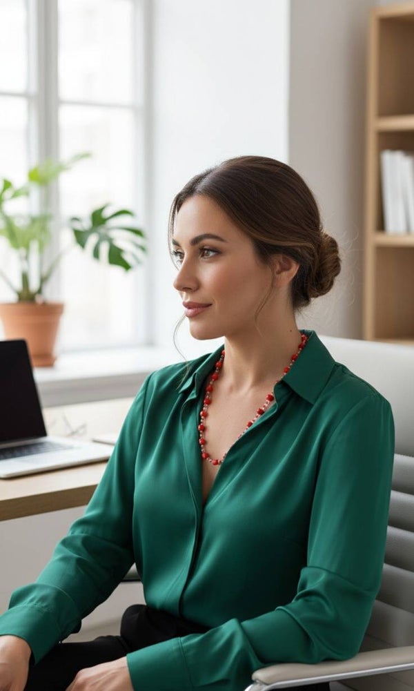 This strikingly beautiful necklace adds a special touch to your outfit. The red glass beads shimmer intensely, catching the light in an elegant way – perfect for special occasions or as a bright accent in everyday life.