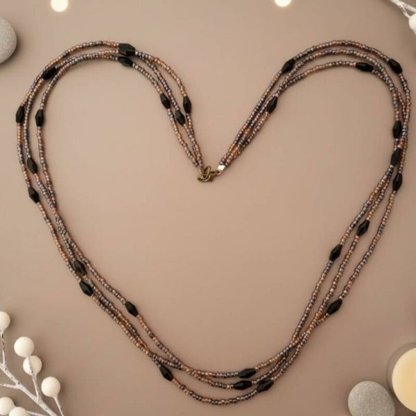 Its refined design combines finely shimmering black and warm bronze glass beads, arranged in delicate layered strands that create beautiful depth, soft movement, and a subtle play of light. The contrast between deep black tones and glowing bronze accents gives the necklace a luxurious yet understated character — bold, but never overpowering.