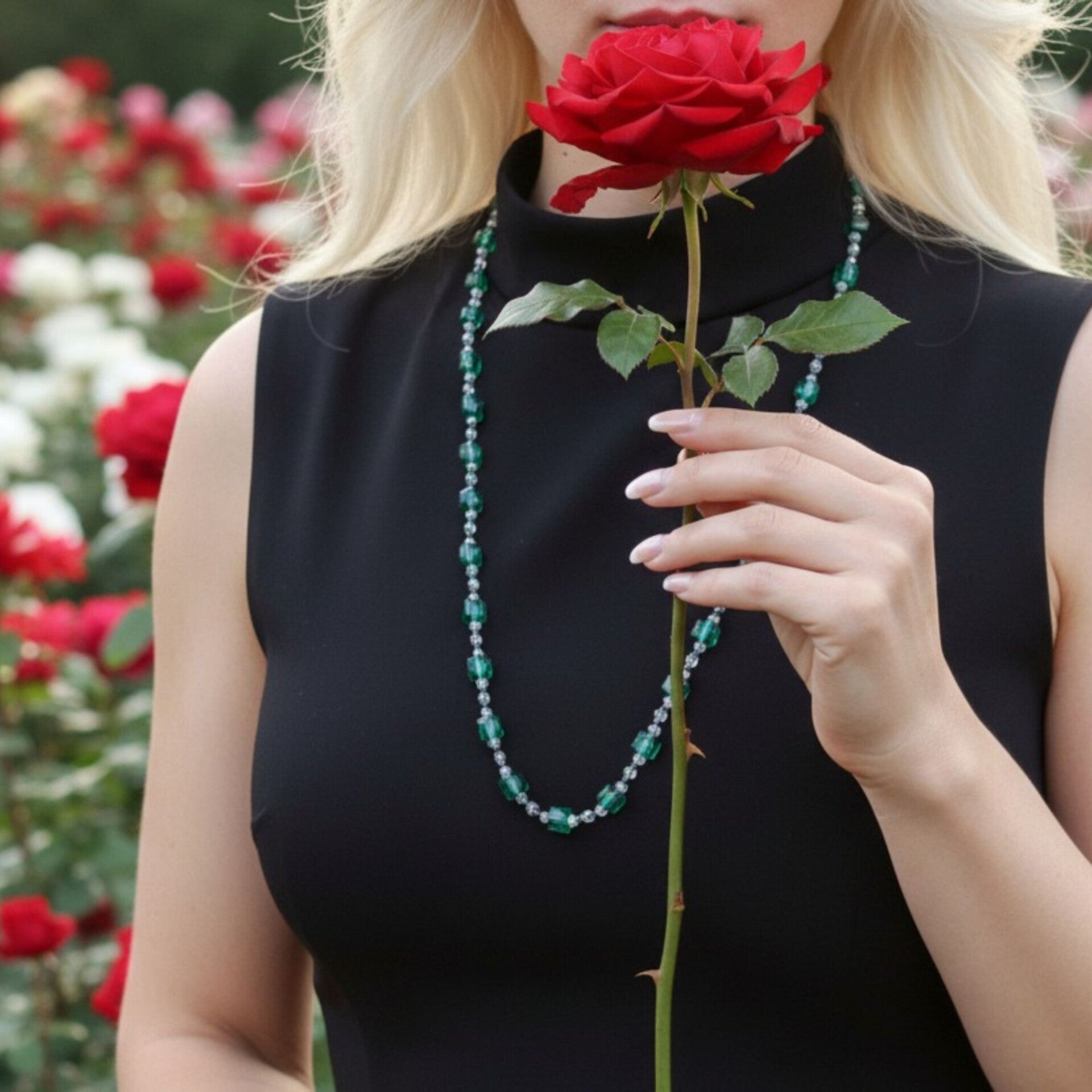 Handcrafted with faceted emerald-green glass beads and luminous crystal accents, this necklace creates a refined architecture of light and movement. The structured composition forms soft cascades that frame the neckline with elegance, while the interplay of deep green and clear elements adds dimension, transparency, and subtle brilliance.