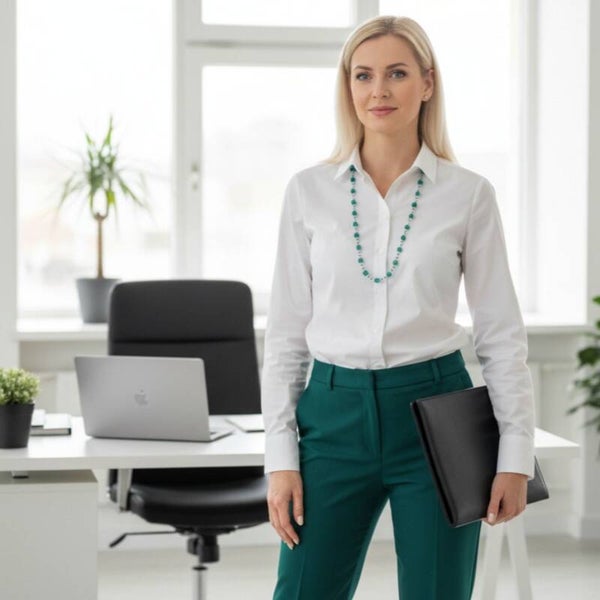 Each piece is carefully handcrafted bead by bead, making every necklace unique. The craftsmanship highlights precision, harmony, and individuality — a balance between artistic detail and modern clarity.