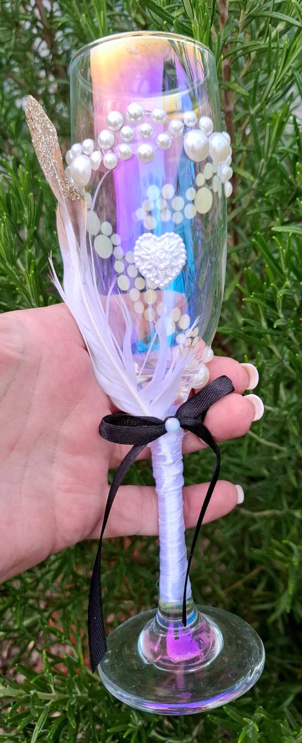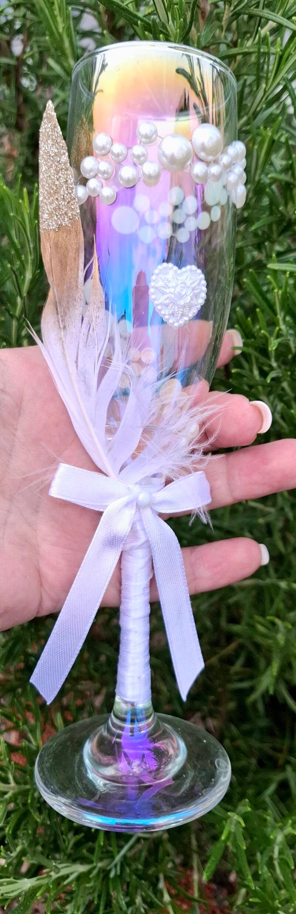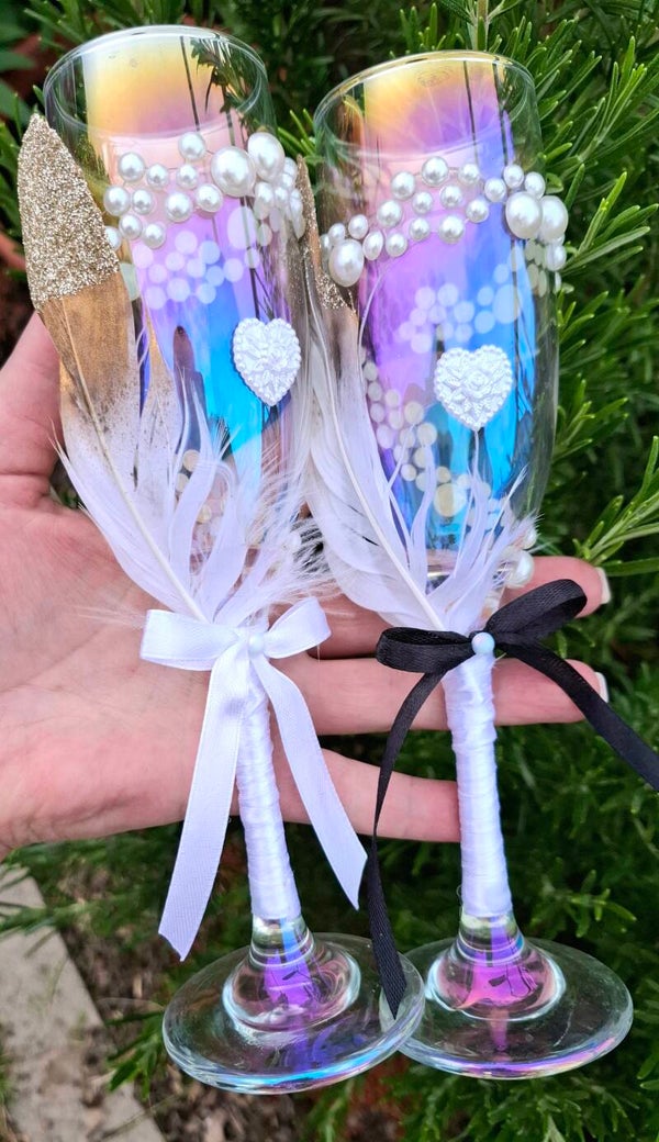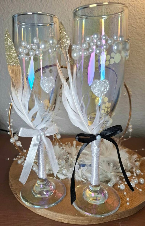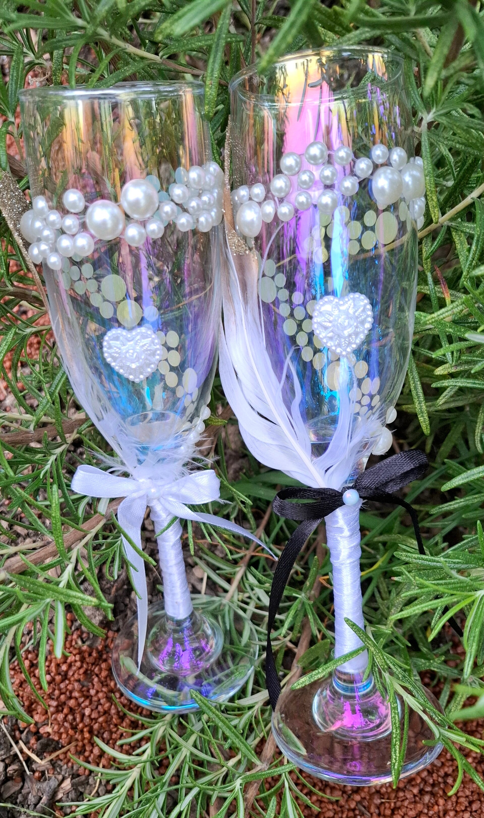 For your special day: These hand-decorated glasses with pearls, satin ribbons, and heart details stand for love, elegance, and lasting memories.
