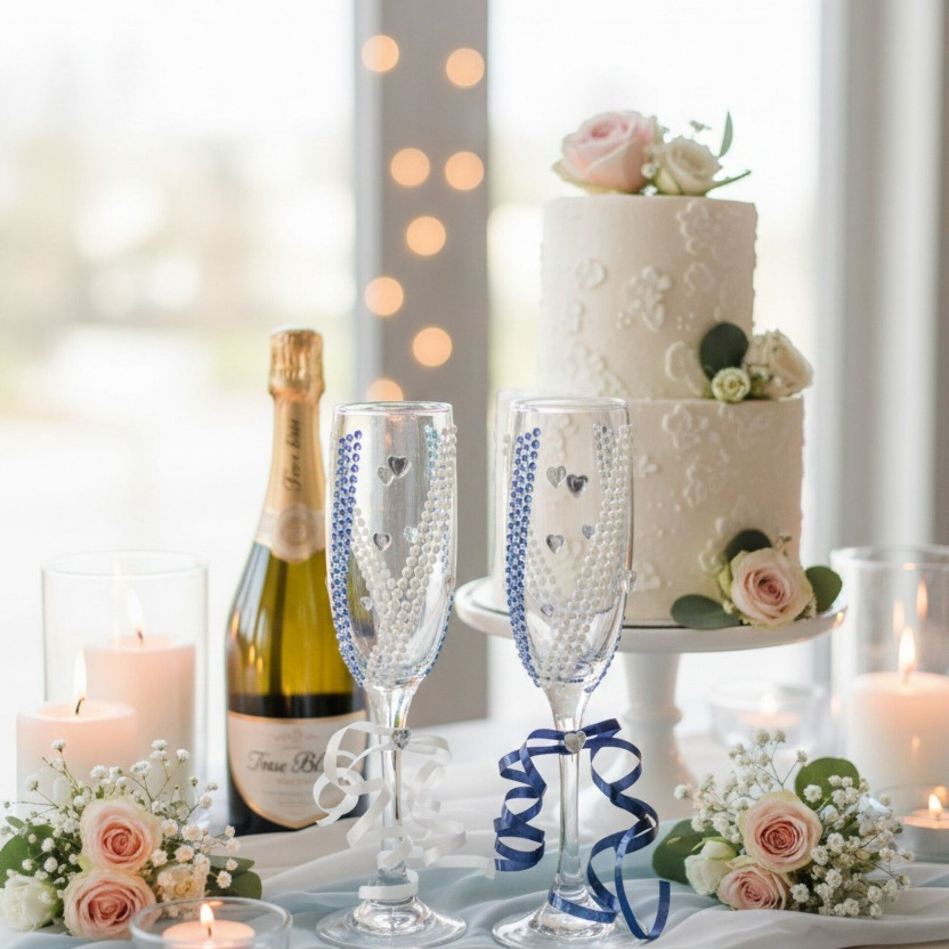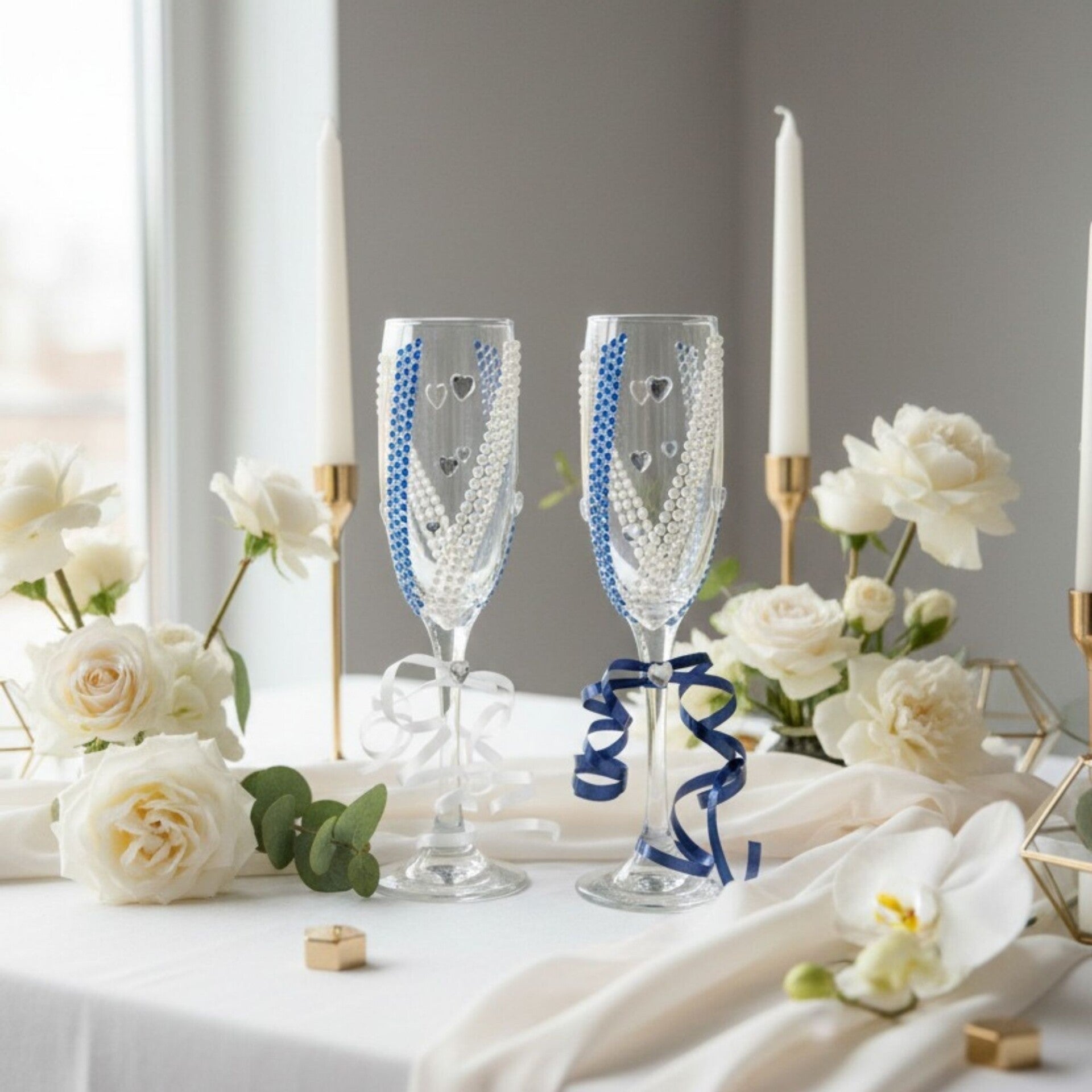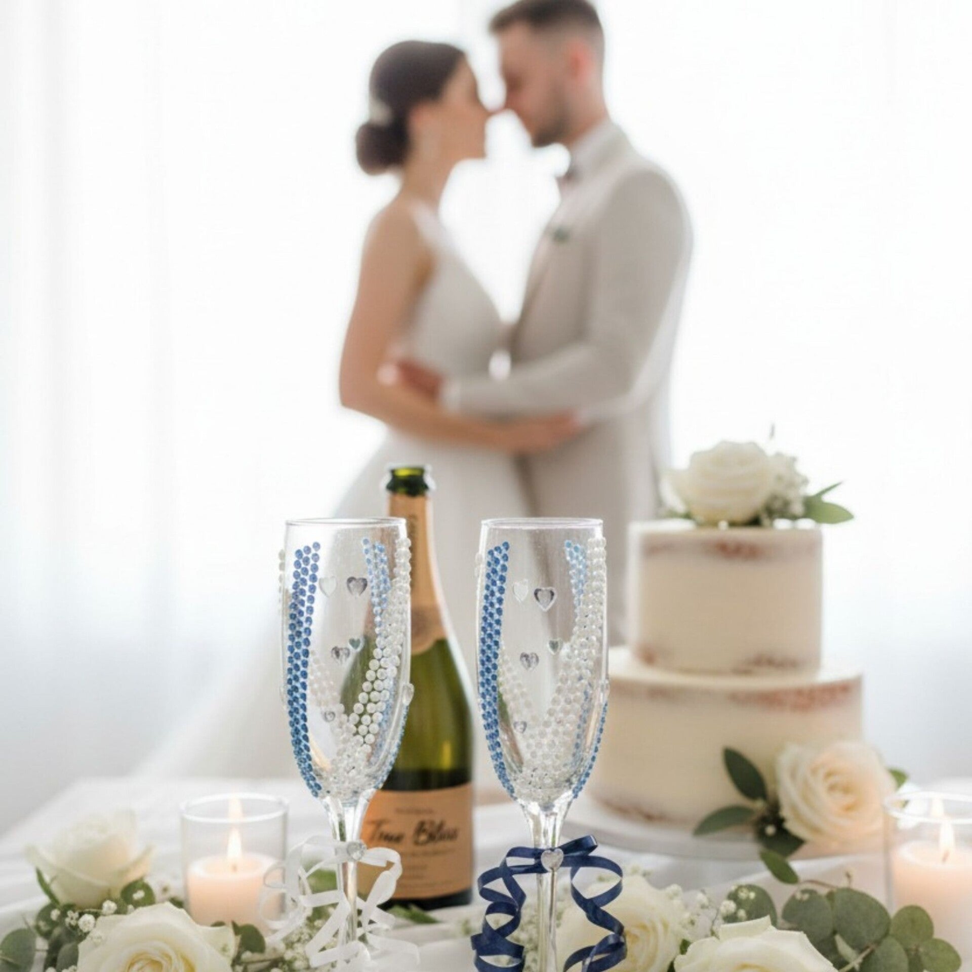 True Bliss is a lovingly hand-decorated set of champagne glasses created to symbolize genuine happiness and heartfelt connection. Adorned with delicate pearls, soft white and blue ribbons, and a charming heart detail, these glasses bring a sense of calm elegance and emotional warmth to your special moment.