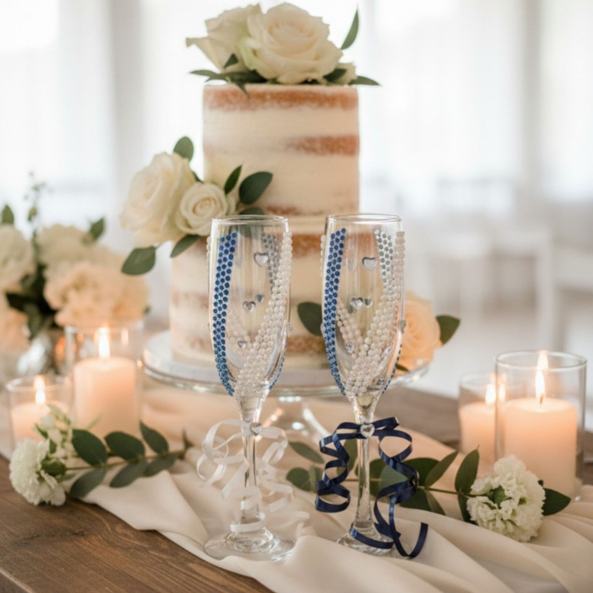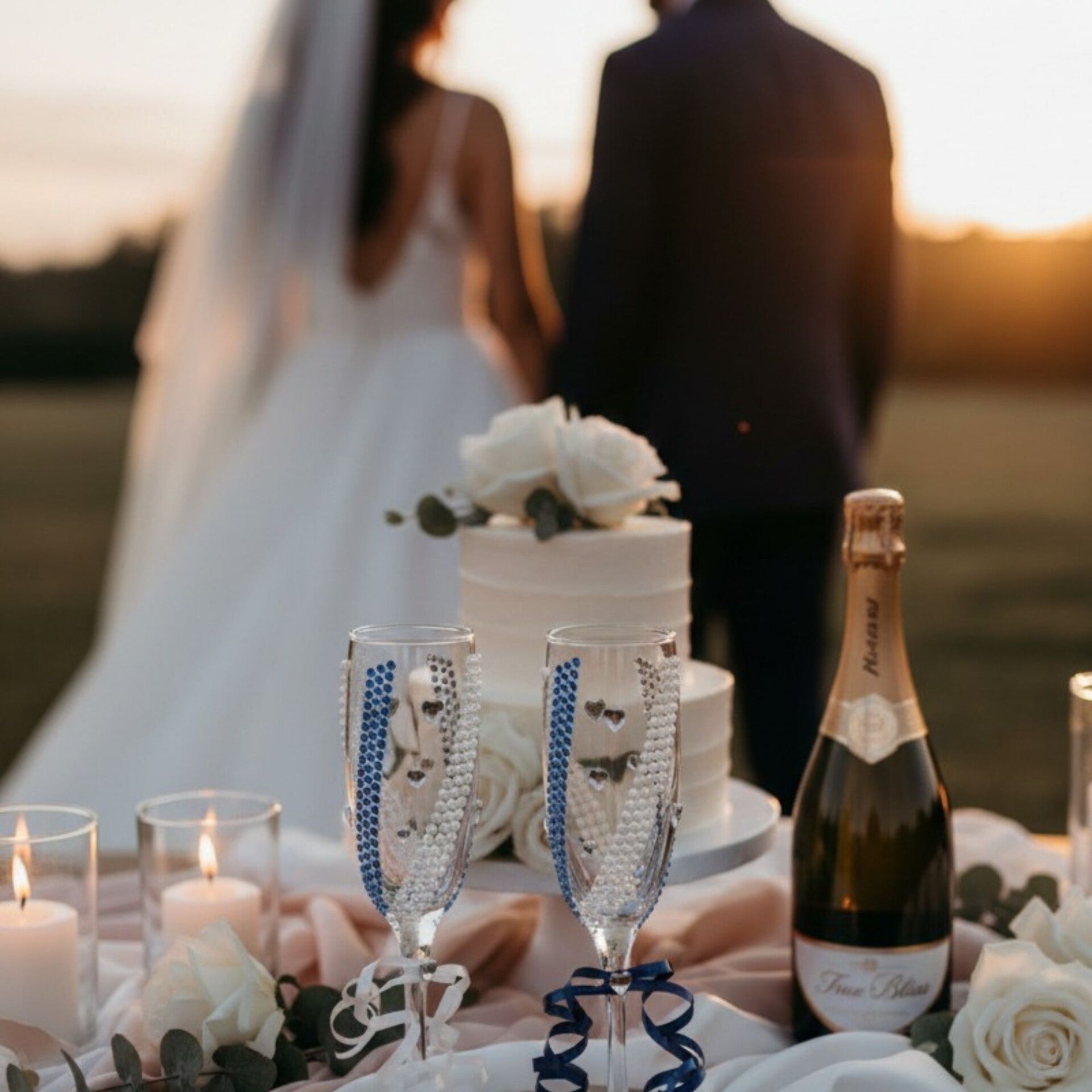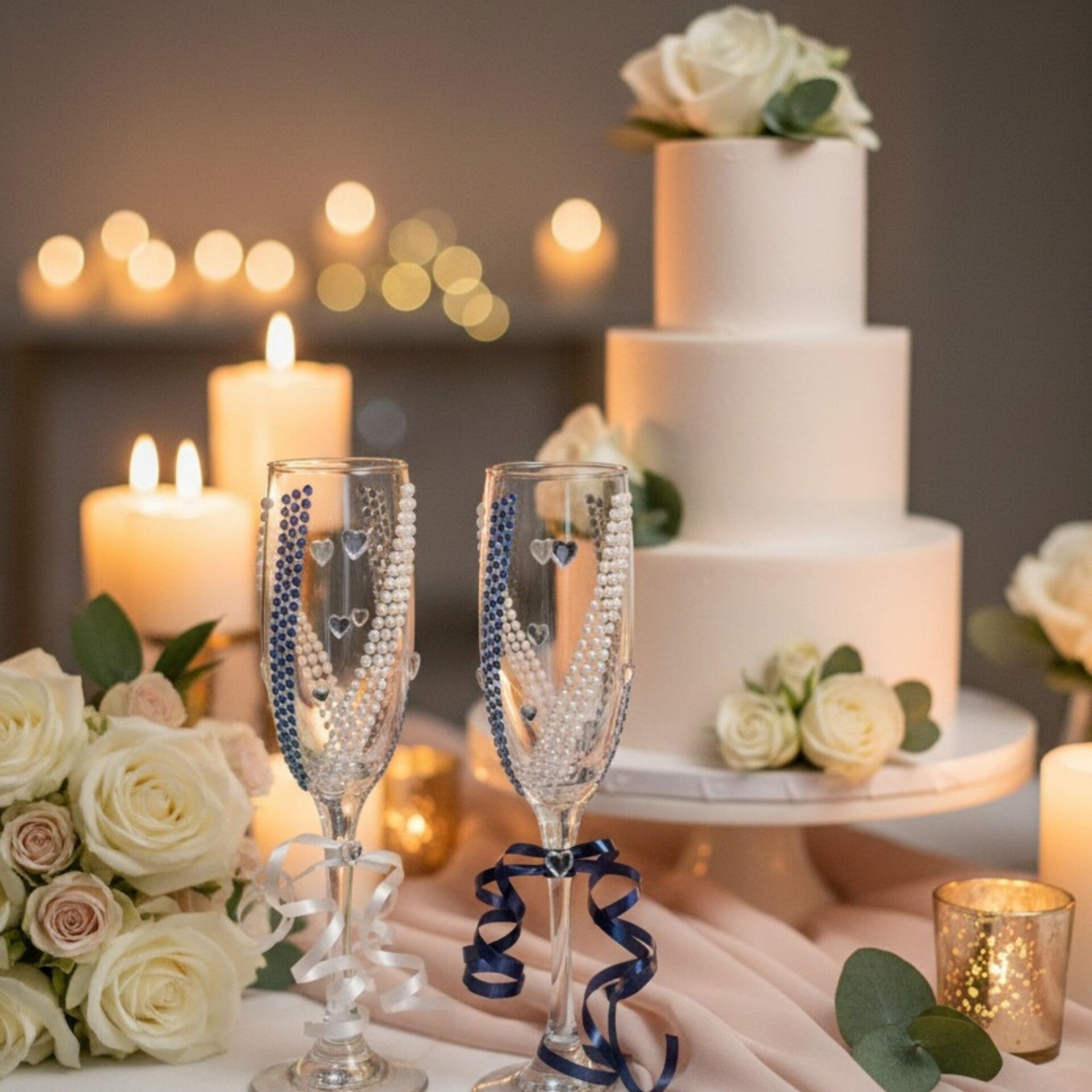 True Bliss is a lovingly hand-decorated set of champagne glasses created to symbolize genuine happiness and heartfelt connection. Adorned with delicate pearls, soft white and blue ribbons, and a charming heart detail, these glasses bring a sense of calm elegance and emotional warmth to your special moment.