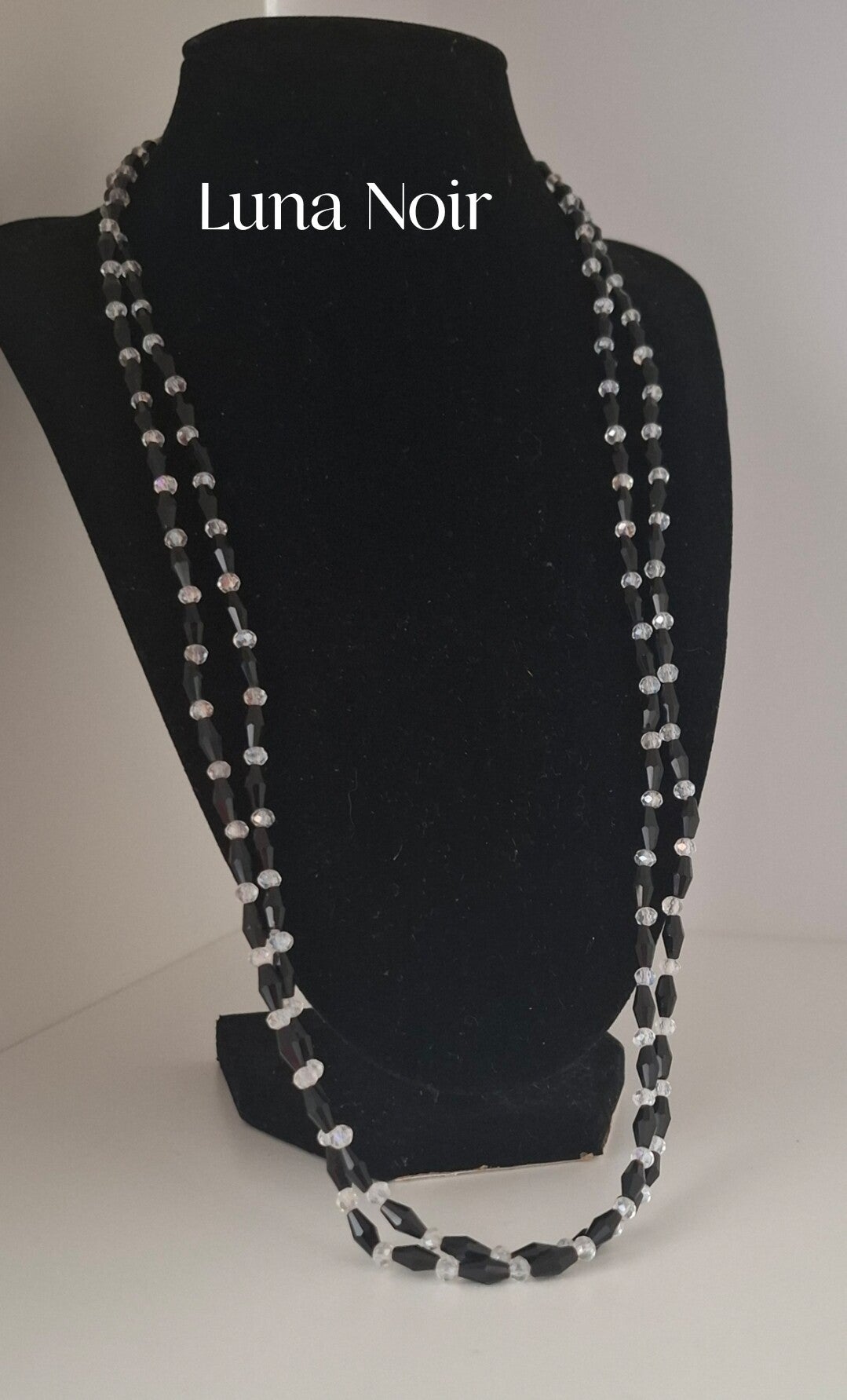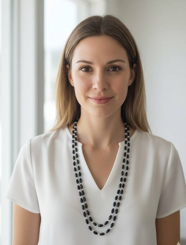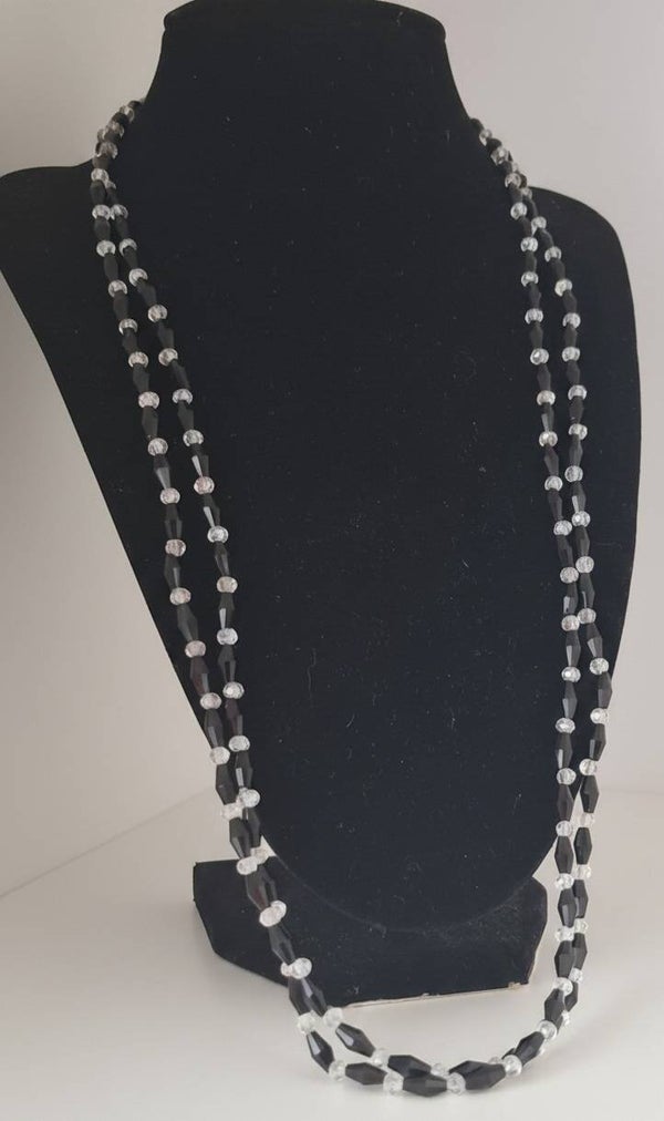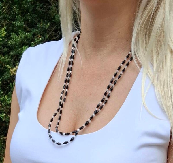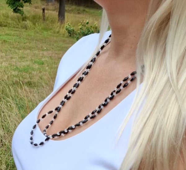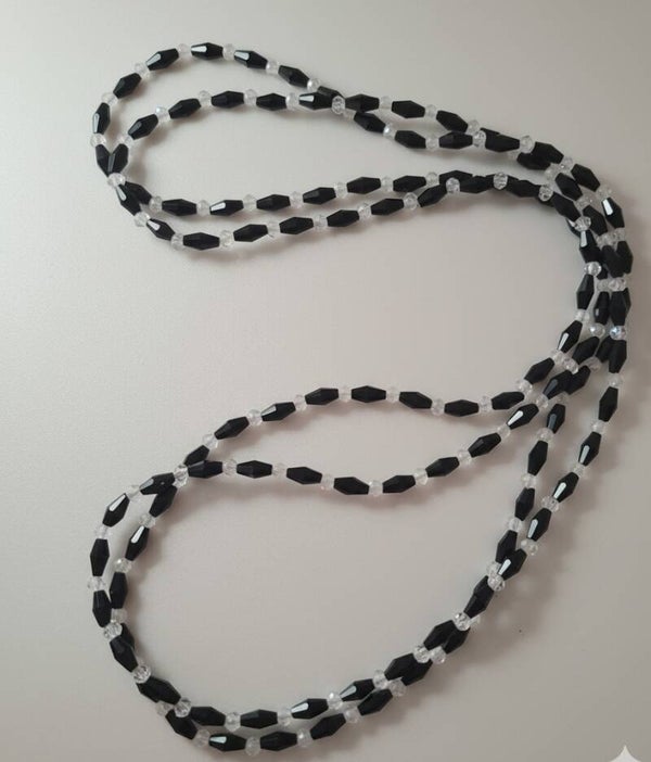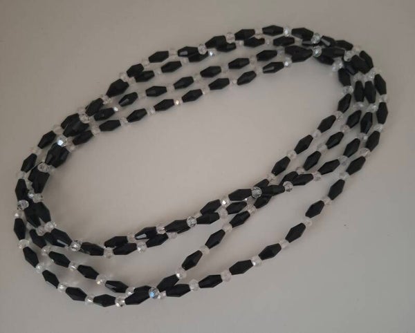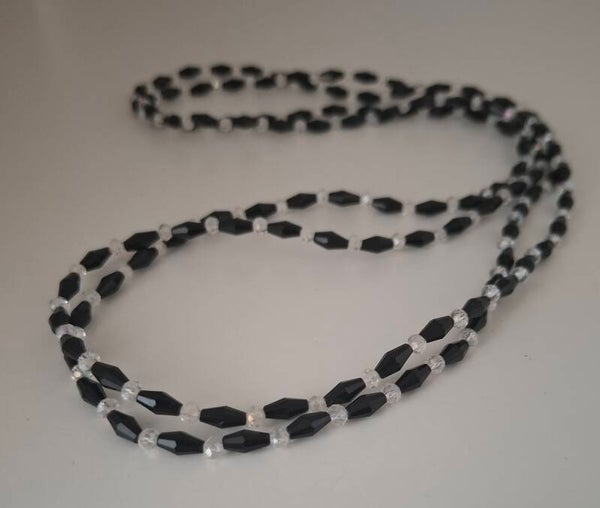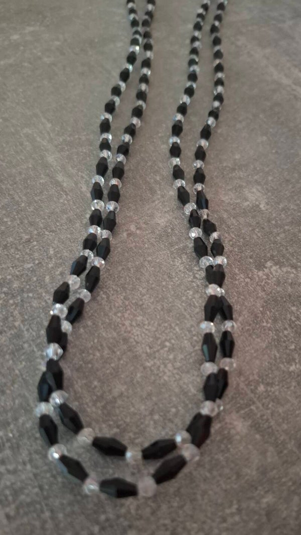 Where light meets night, timeless elegance is born: This necklace combines faceted black and clear glass beads into a play of light, shadow, and movement.