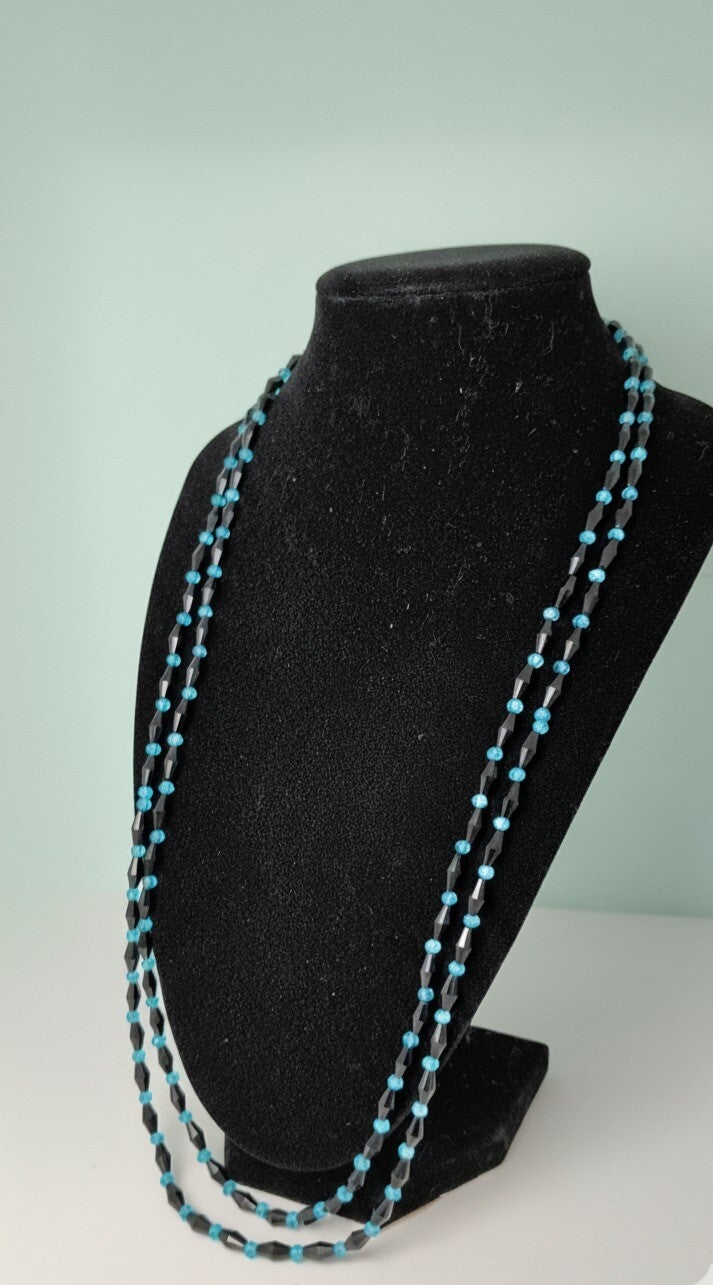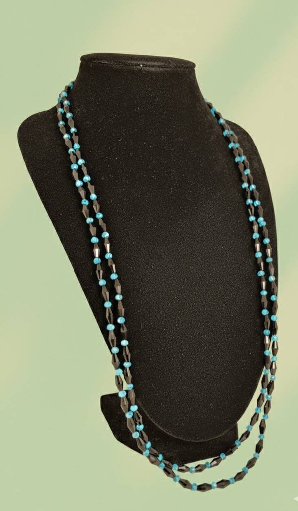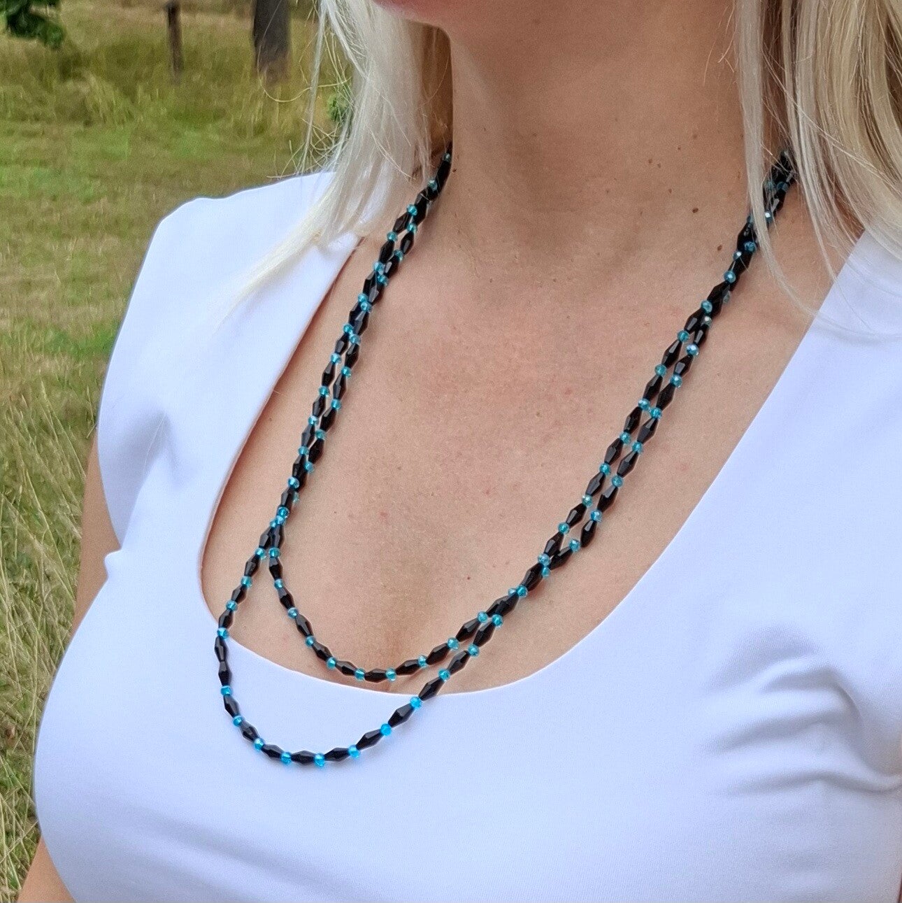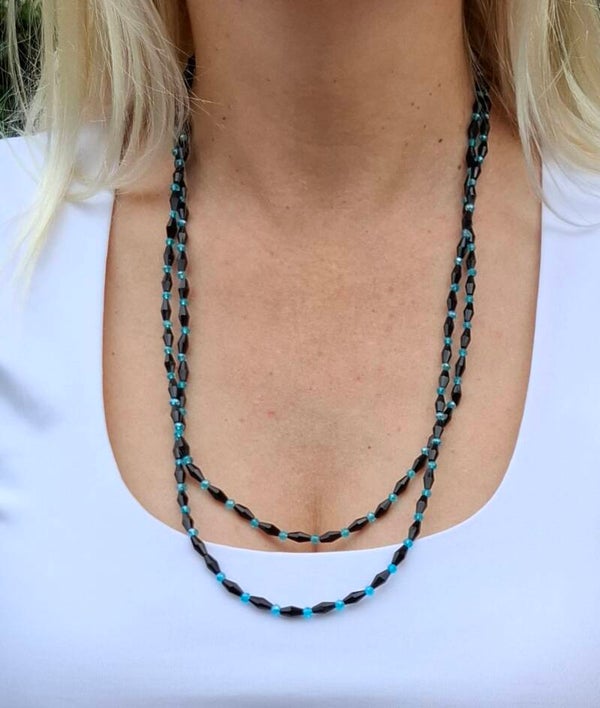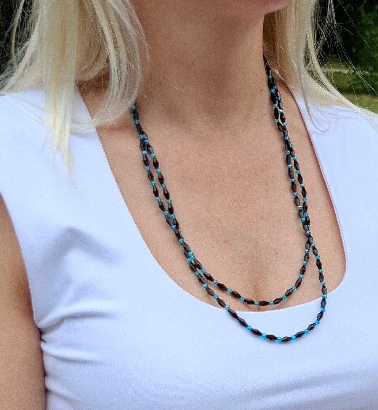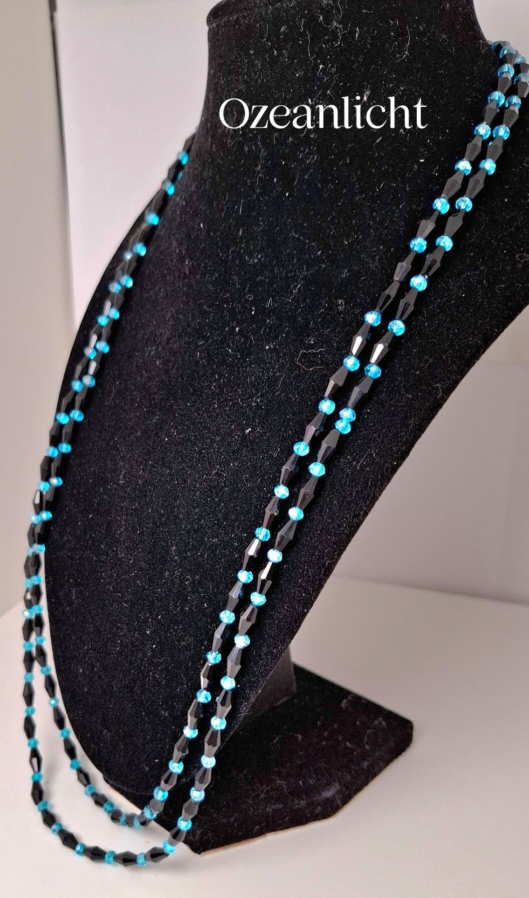 “Ocean Light” combines bold black with vibrant turquoise – a color combination full of depth and character, gently reflecting the light with every movement. This approx. 100 cm long necklace made of faceted glass beads is artfully handcrafted and makes a stylish statement for those who appreciate the unique.