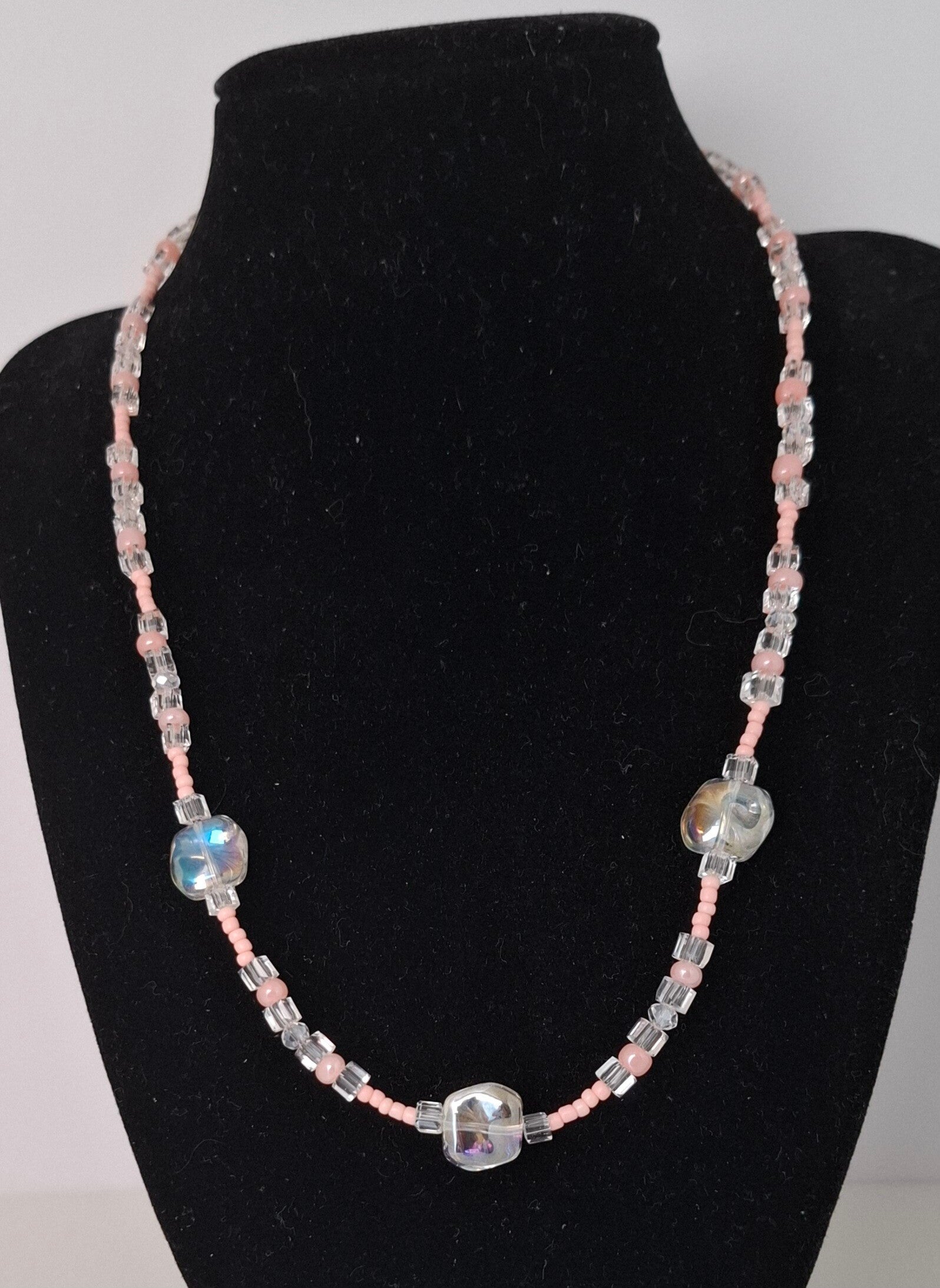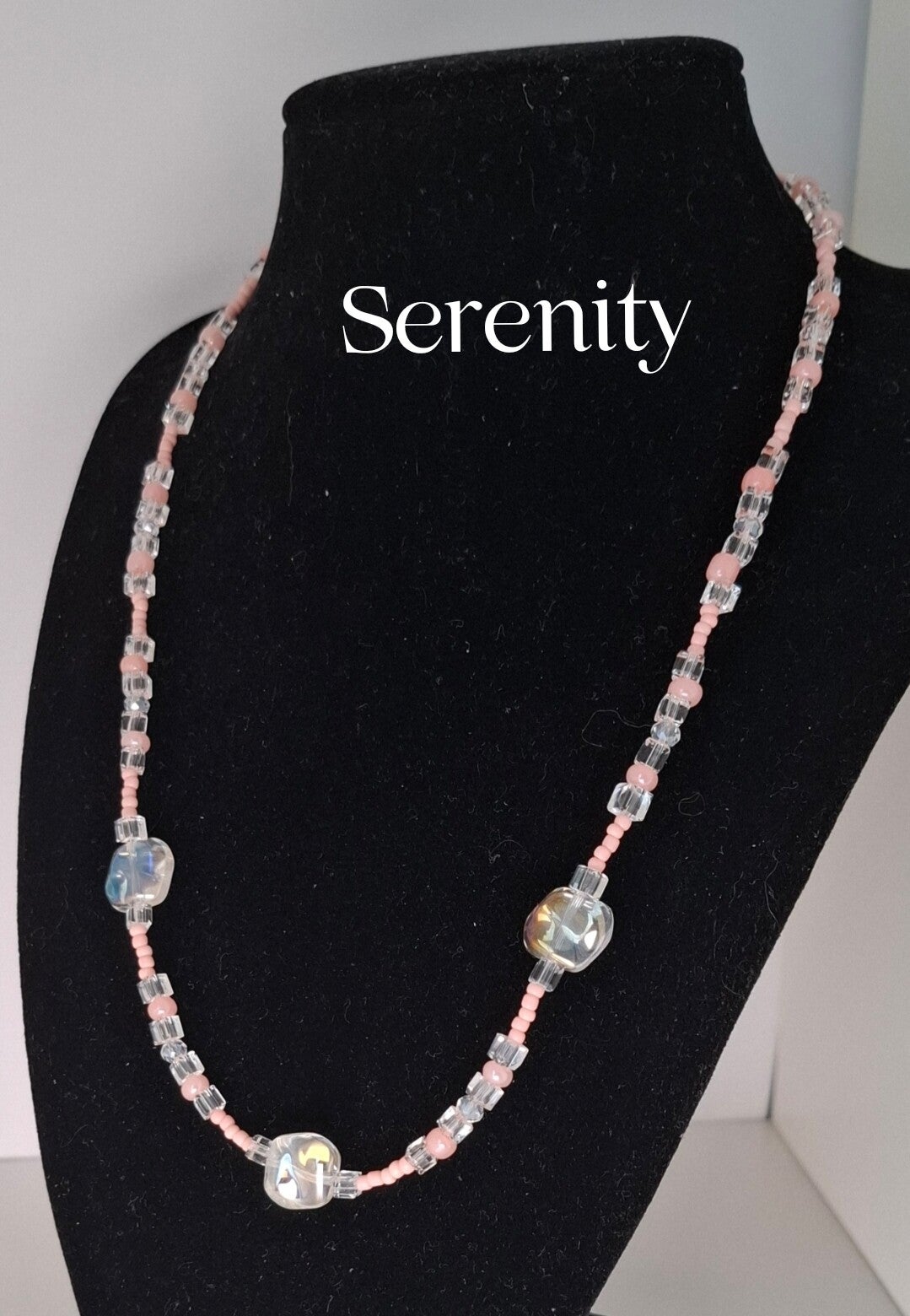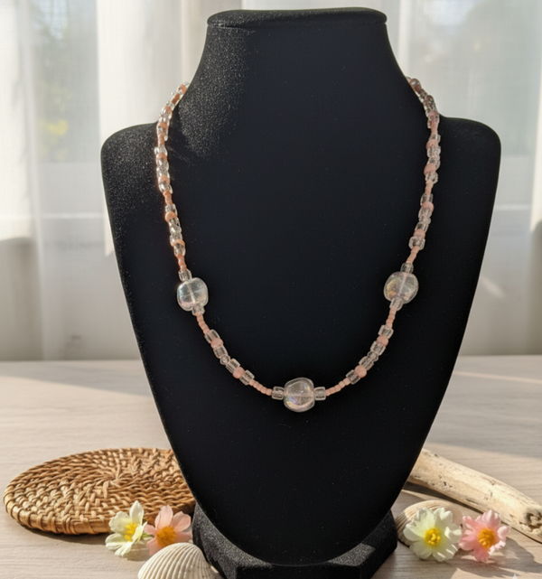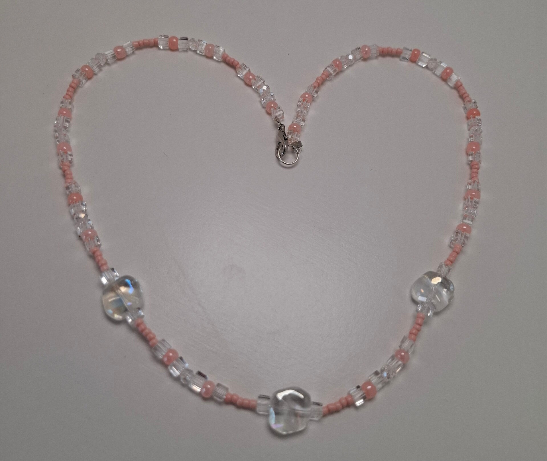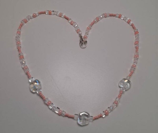Let yourself be enchanted by Serenity – a handmade necklace that highlights your radiance like a soft ray of sunlight. Delicate apricot-colored glass beads meet clear accents, creating a subtle play of light and color that gently enhances your feminine side.