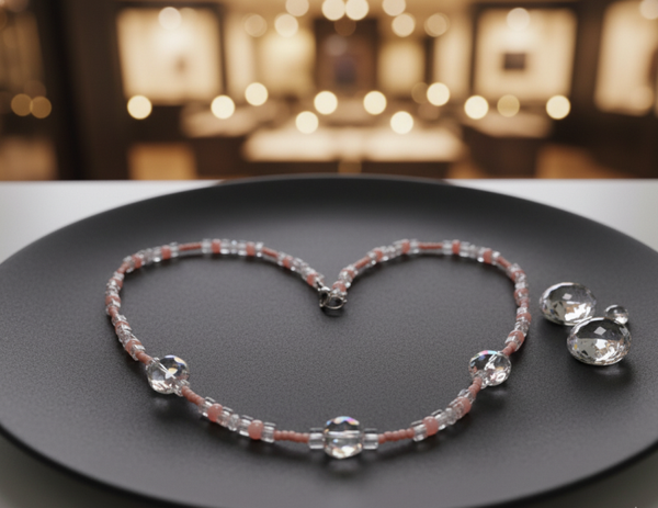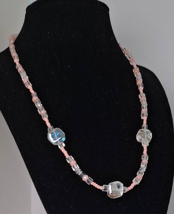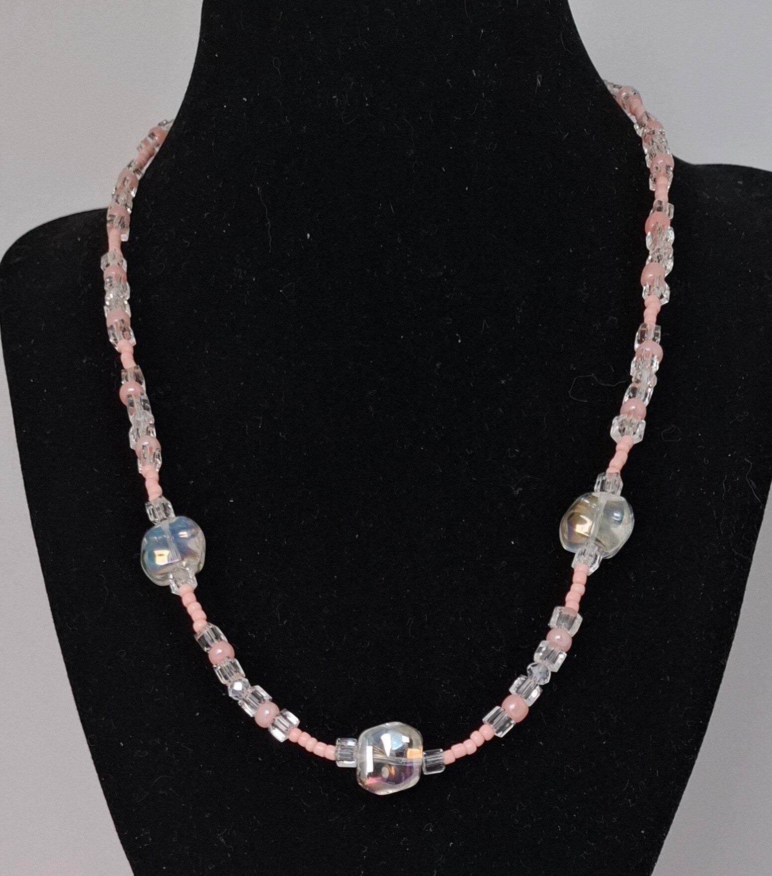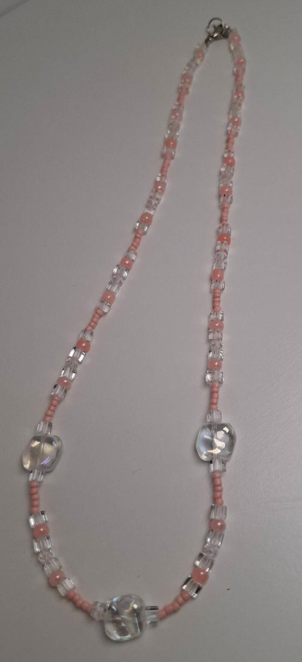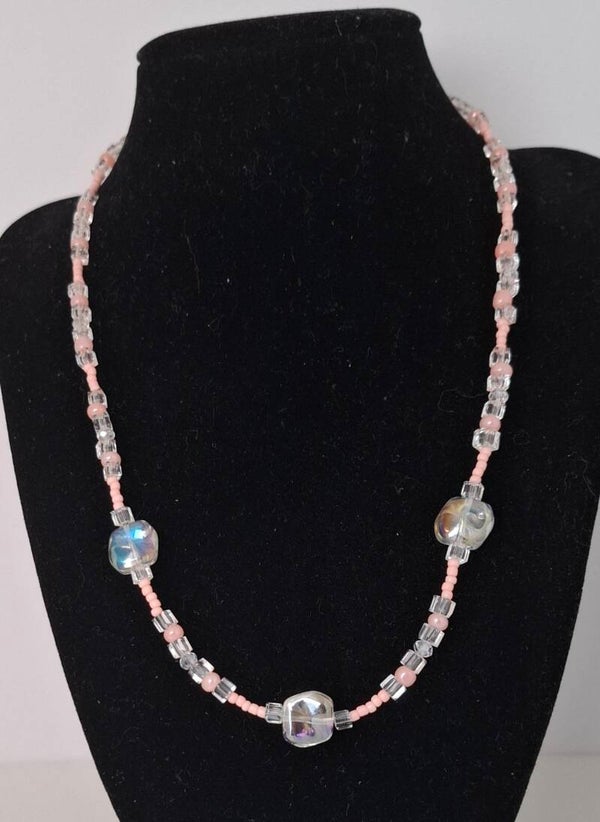 Let yourself be enchanted by Serenity – a handmade necklace that highlights your radiance like a soft ray of sunlight. Delicate apricot-colored glass beads meet clear accents, creating a subtle play of light and color that gently enhances your feminine side.