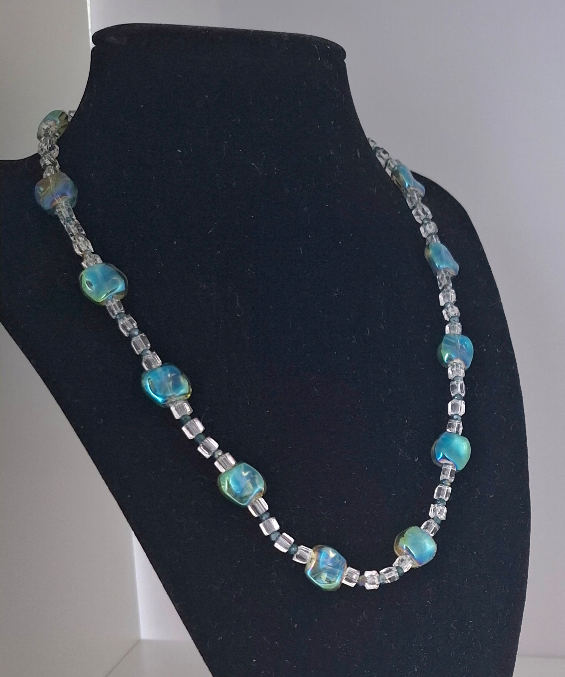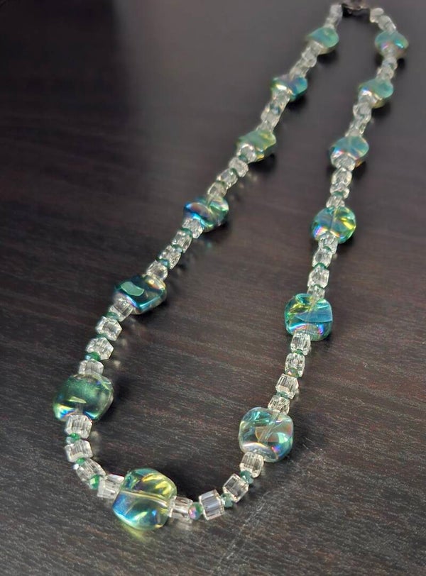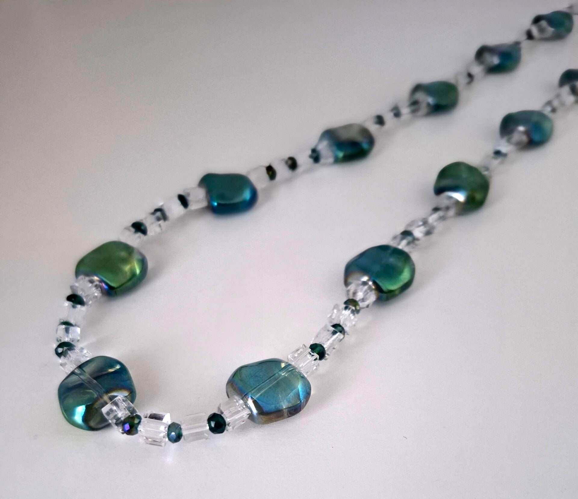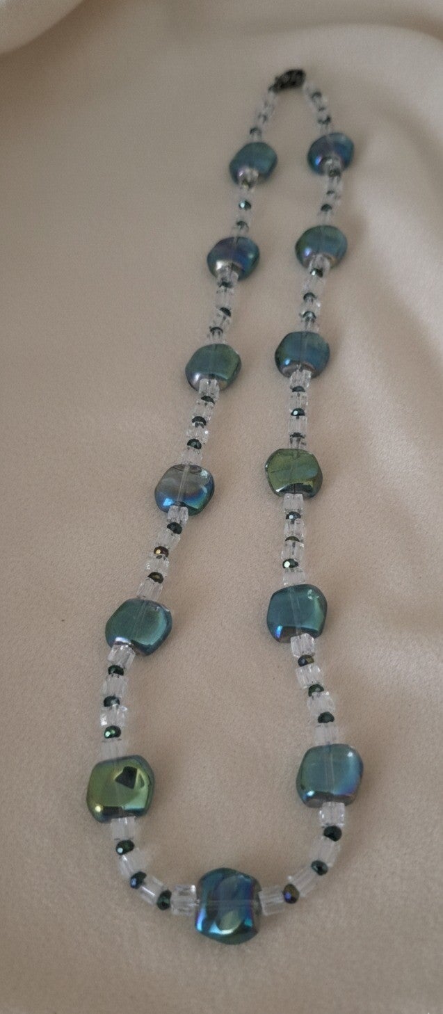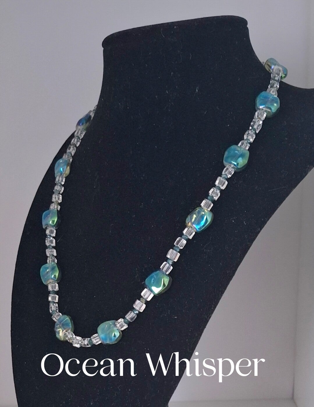 “Ocean Whisper” is a handmade necklace that captures the dance of waves and light with shimmering blue-green glass beads and sparkling clear cubes. Each bead is lovingly selected and carefully arranged, giving the necklace a sense of lightness, connection to nature, and timeless elegance.