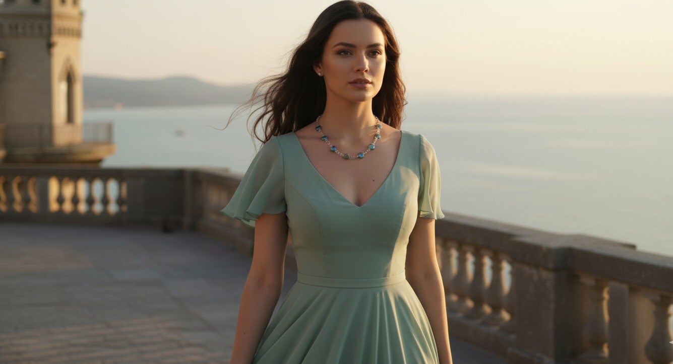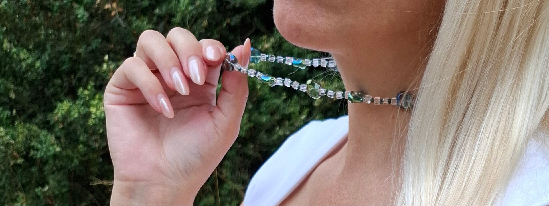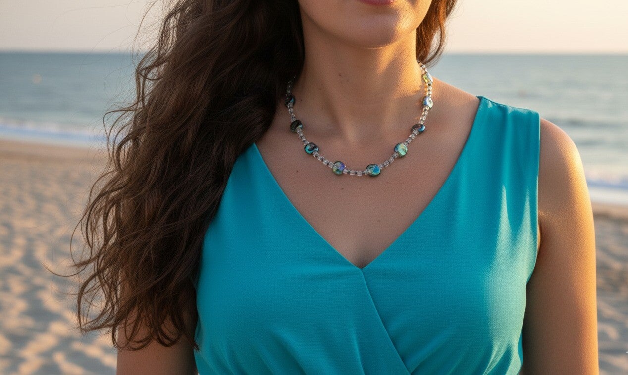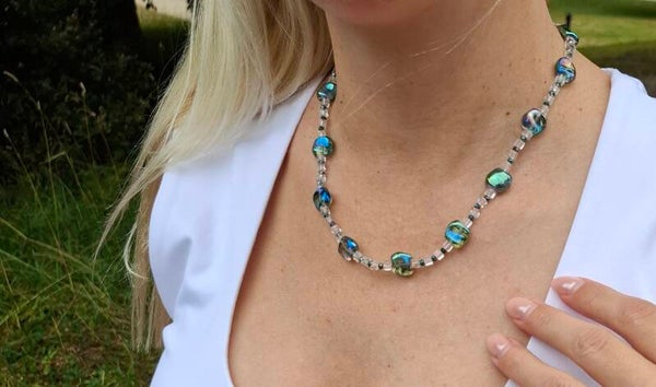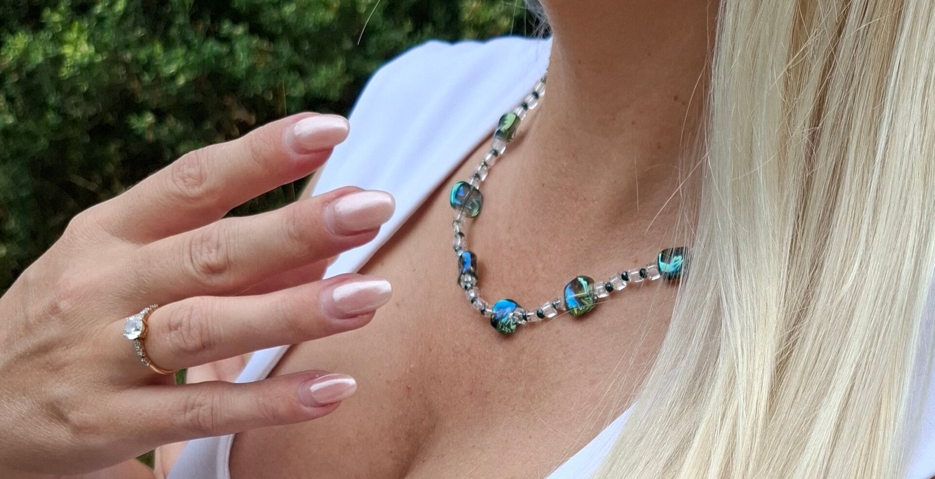 “Ocean Whisper” is a handmade necklace that captures the dance of waves and light with shimmering blue-green glass beads and sparkling clear cubes. Each bead is lovingly selected and carefully arranged, giving the necklace a sense of lightness, connection to nature, and timeless elegance.