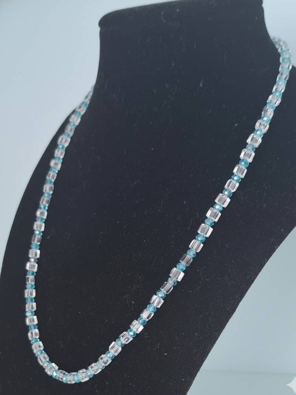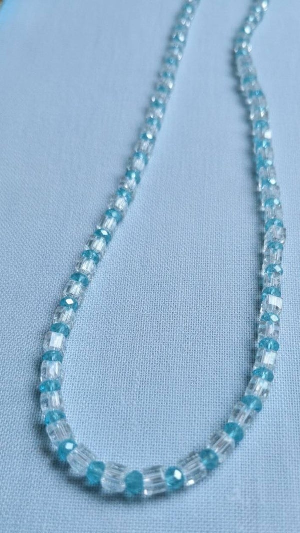 **"Aqua" is like a gentle summer breeze by the sea, softly caressing your skin and bringing lightness into your day. This delicate, handcrafted necklace from the Crystal Harmony Collection combines clear, cube-shaped glass beads with subtle turquoise accents that shimmer quietly with every movement.