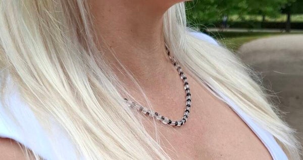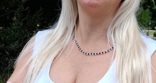 Sometimes it doesn’t take much to stand out. “Ebony” is a delicate necklace that expresses quiet strength through its simplicity. Black glass beads meet transparent crystal – clear, calm, yet expressive.