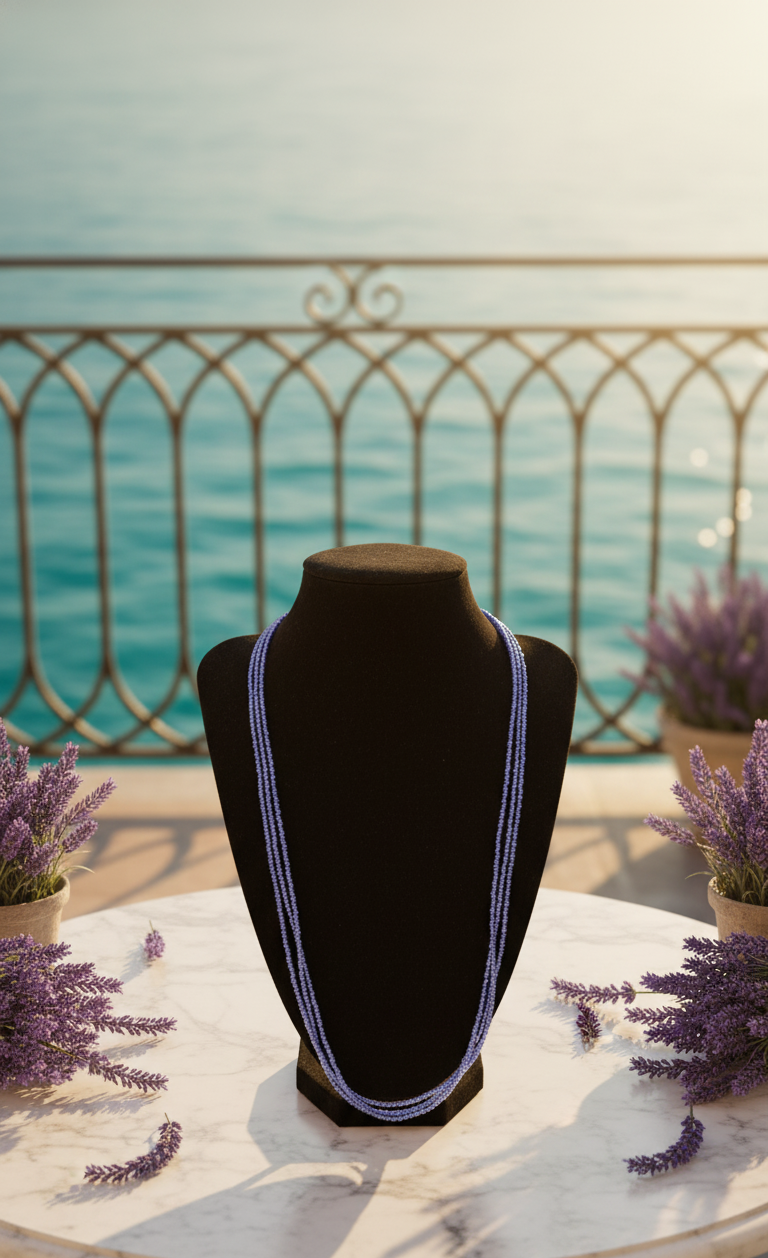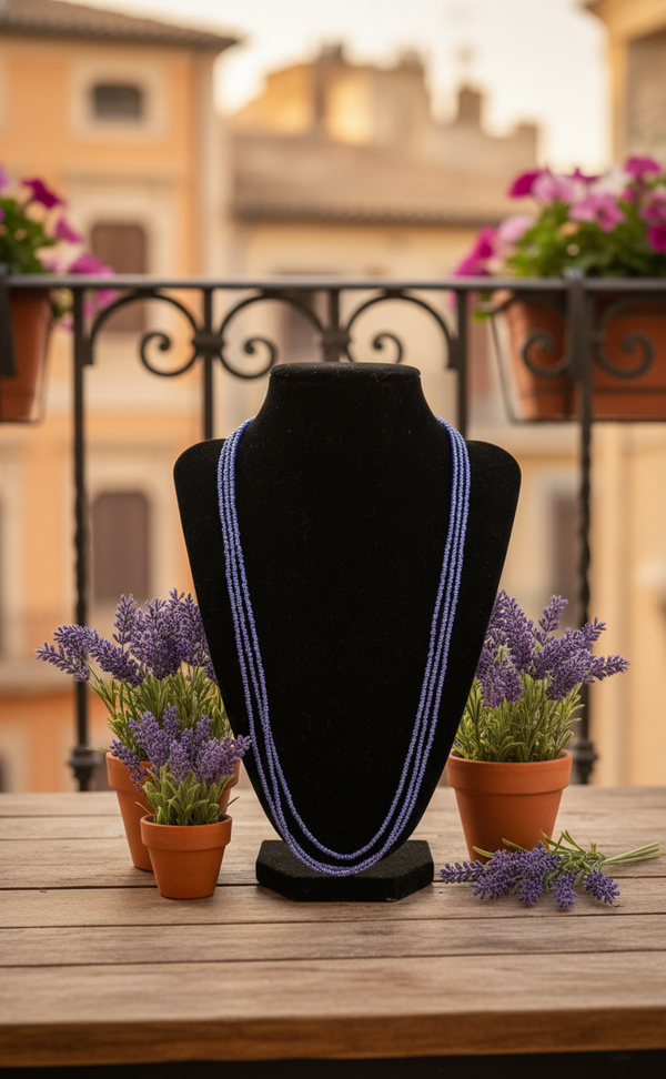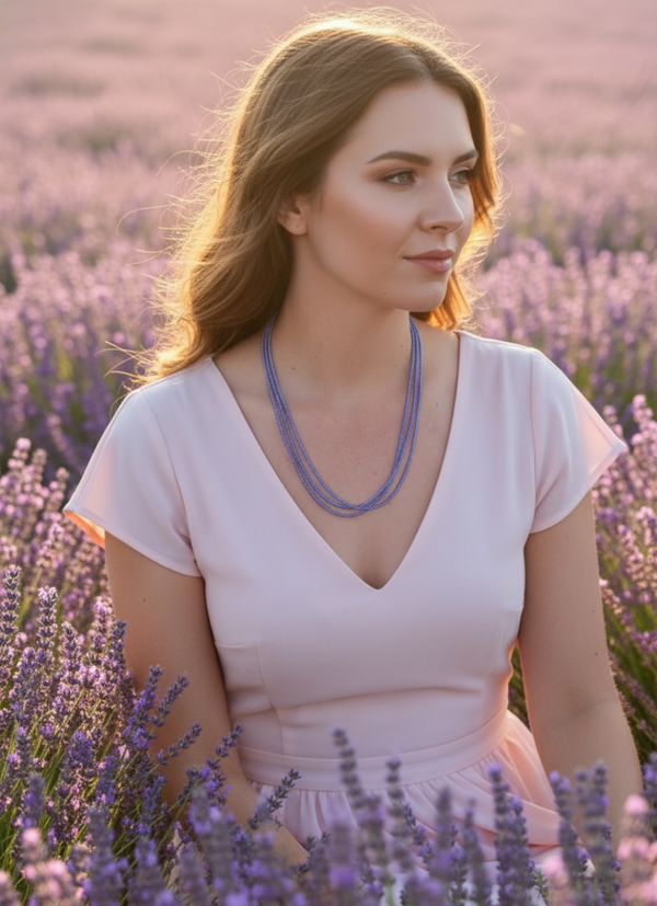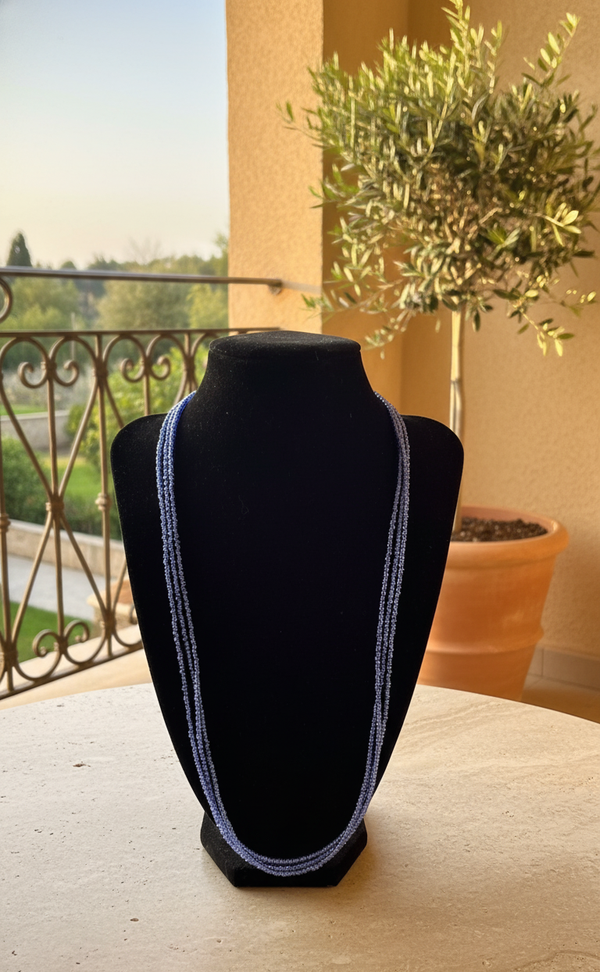 Sometimes, all it takes is a hint of color to make the day feel a little brighter. “Lavender Haze” is a delicate glass bead necklace in soft lavender blue, radiating lightness and calm – like the moment when the early morning sky glows in shades of lavender.