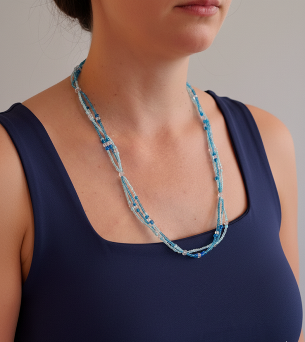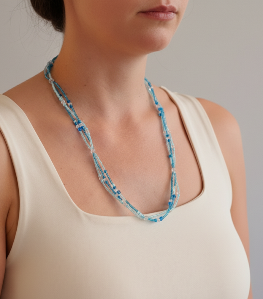 Like a day by the sea: Blue Lagoon is a delicate necklace made of shimmering glass beads in soft shades of blue, reminding you of sparkling waves and the scent of summer. It rests lightly around your neck and brings a touch of freedom into your everyday life – without being loud.