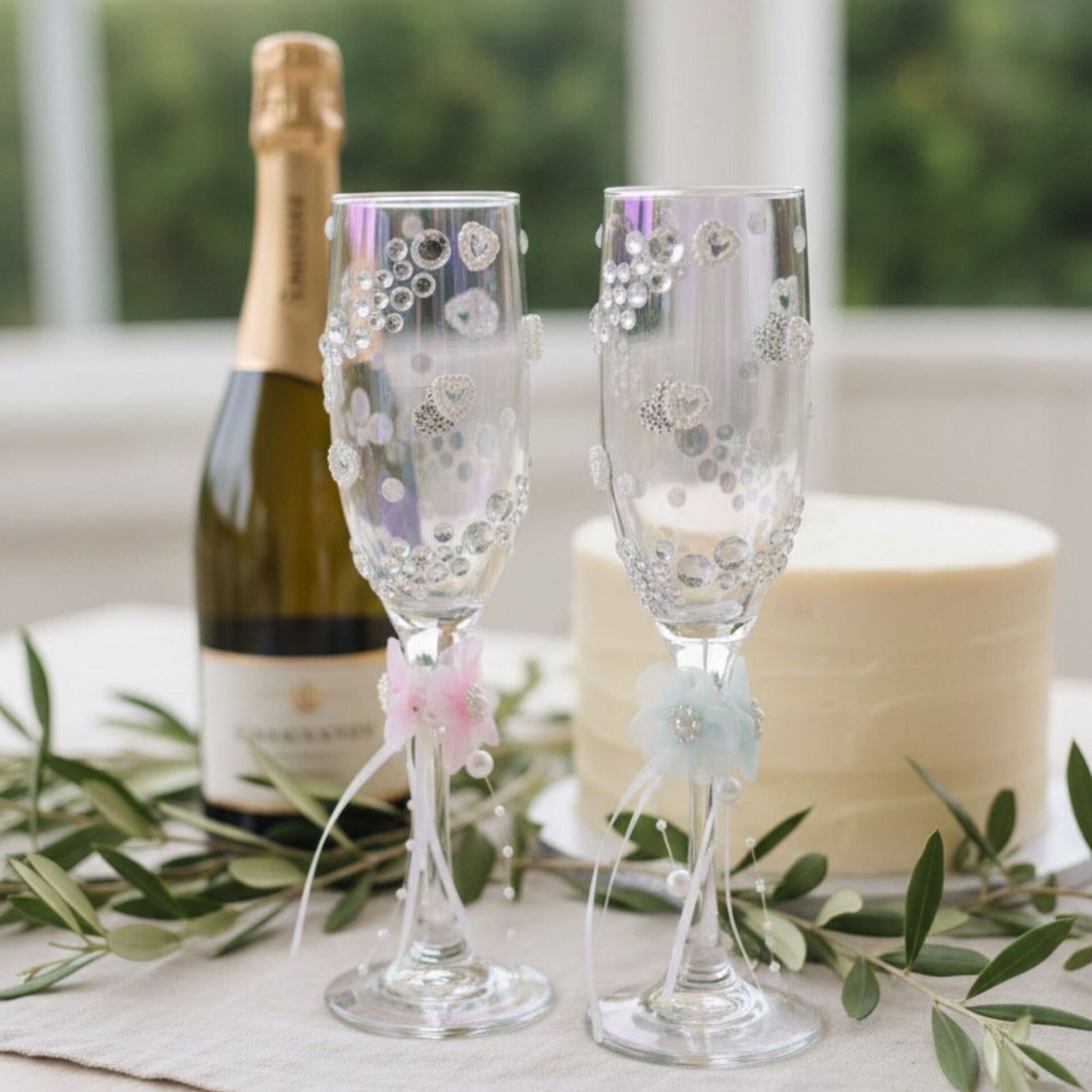 Lovingly hand-decorated with sparkling rhinestones, delicate pearls and soft floral elements, each glass captures a feeling of lightness and quiet elegance. The design is refined yet expressive, created to complement your wedding table without overpowering it – graceful, romantic and timeless.