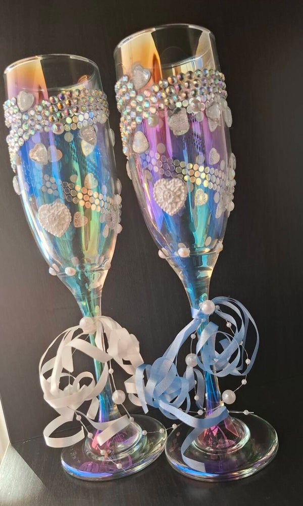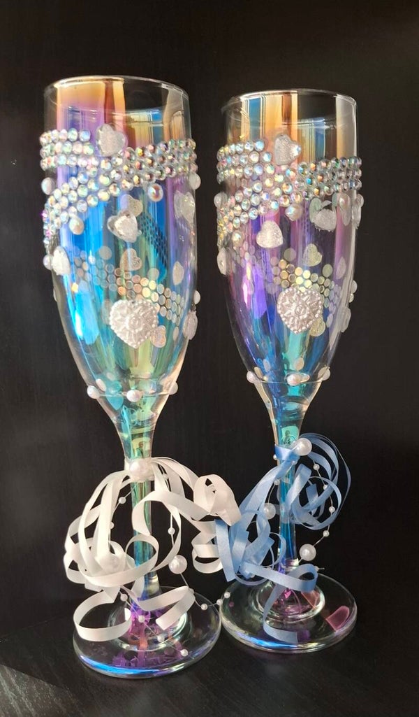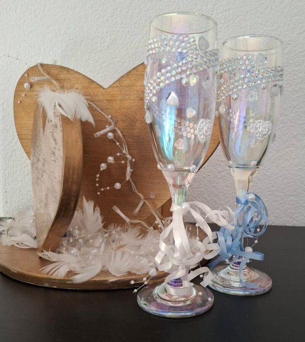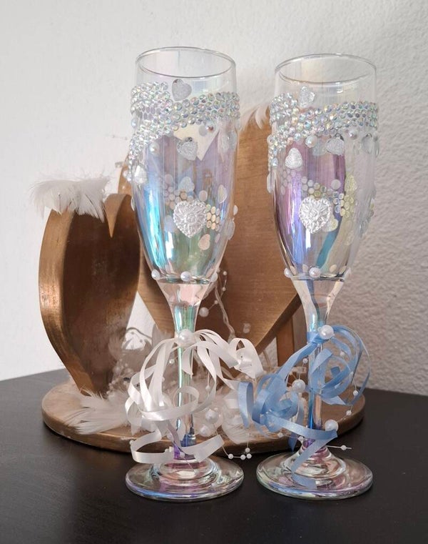 Our Frosted Hearts hand-decorated champagne glasses feature sparkling stones, delicate pearls, and soft satin ribbons that catch the light – turning your wedding toast into a truly special moment. Each glass is a lovingly crafted one-of-a-kind piece, celebrating your love – whether on your wedding day, at an engagement party, or as a thoughtful gift for a special couple.