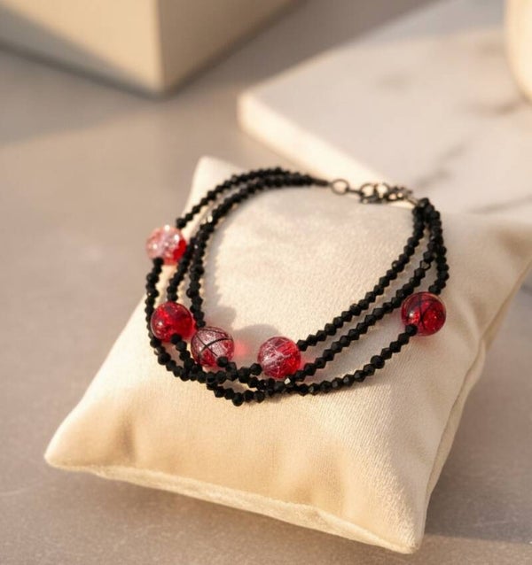 This three-strand bracelet combines vibrant red crackle beads with sparkling black crystal beads, giving your look an elegant, bold touch. Handmade on durable nylon thread and finished with a black lobster clasp, it sits comfortably on your wrist and can be easily adjusted thanks to the extension chain.