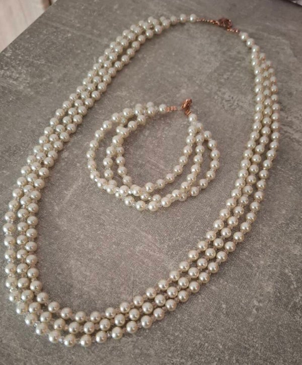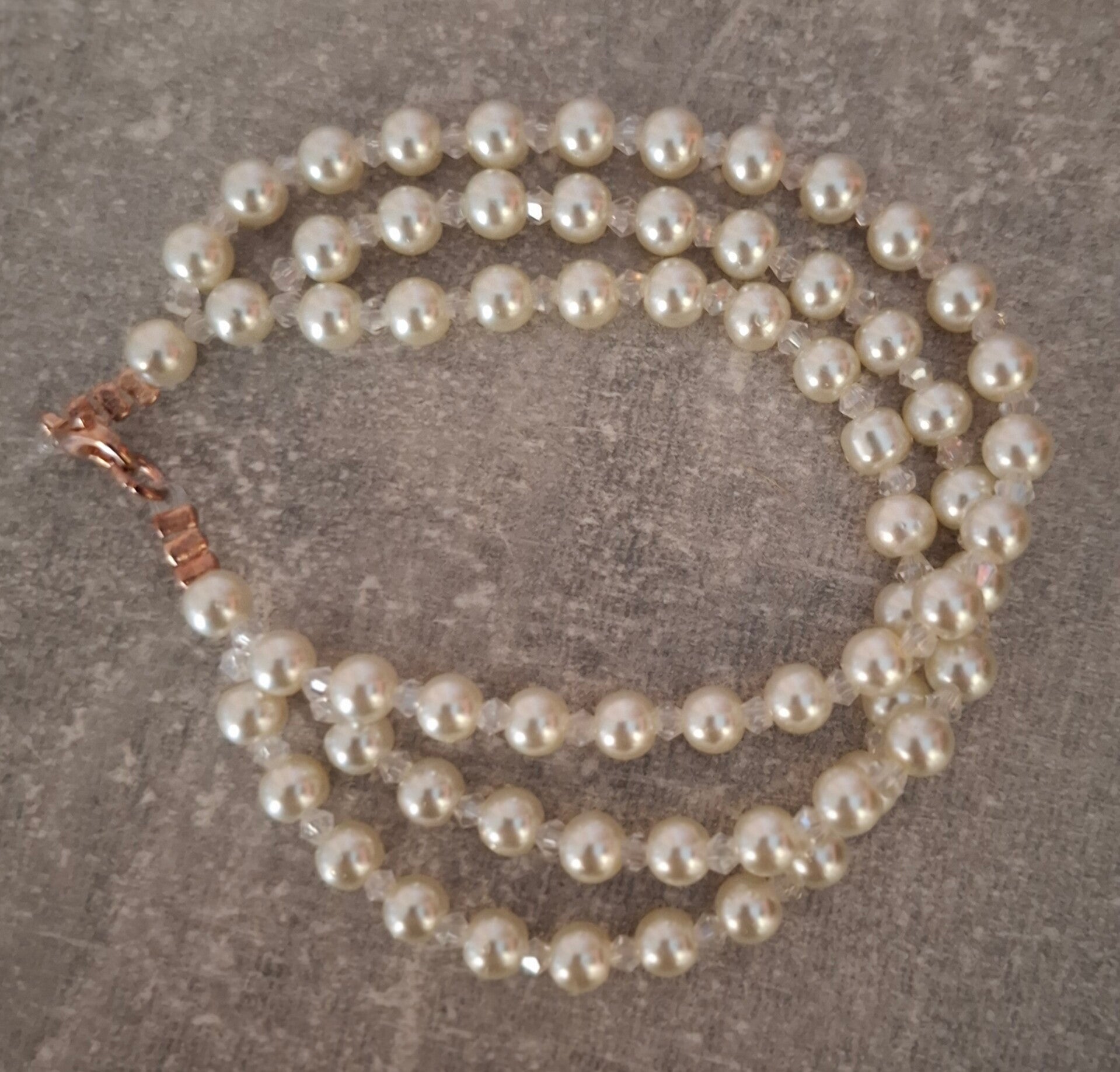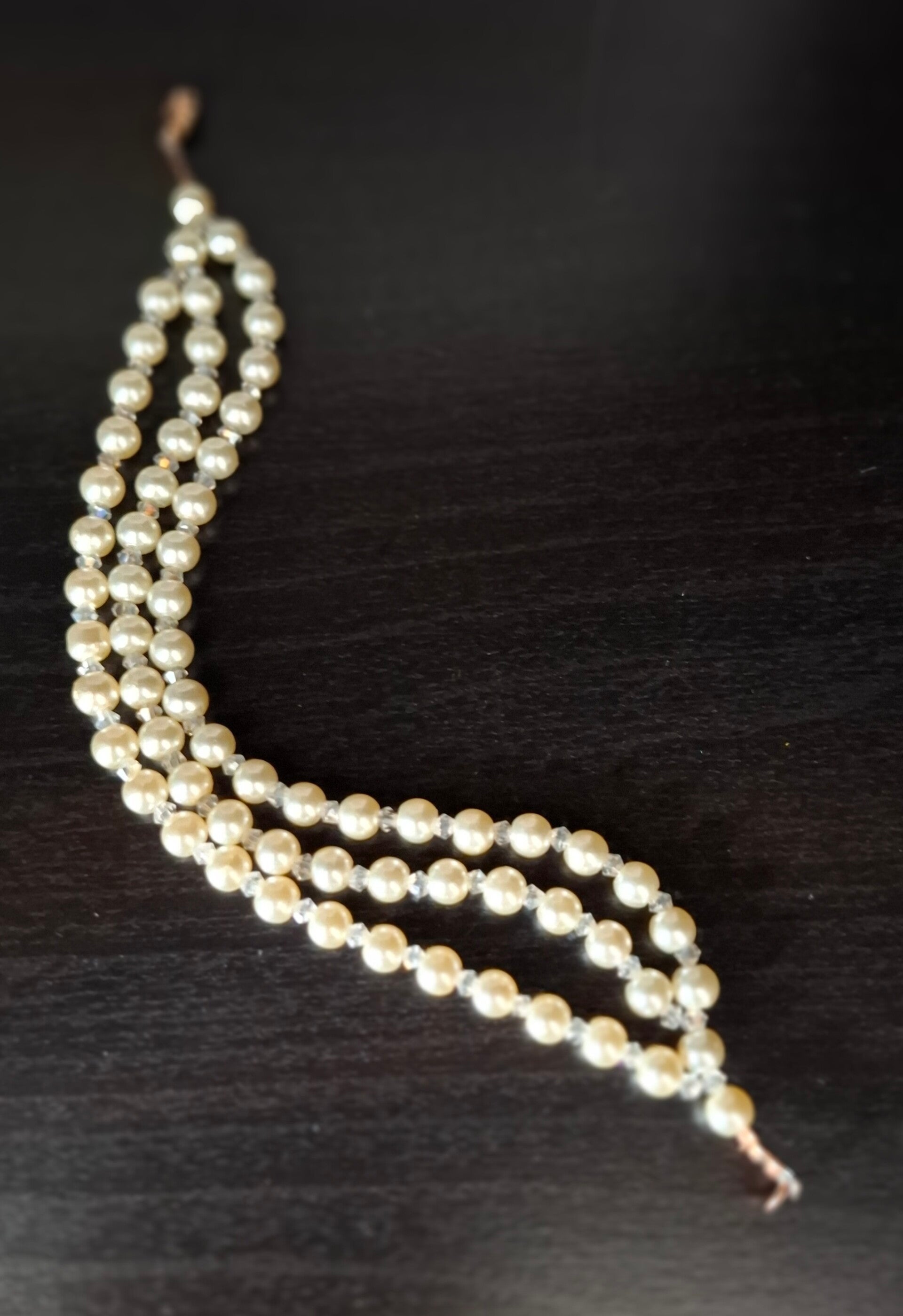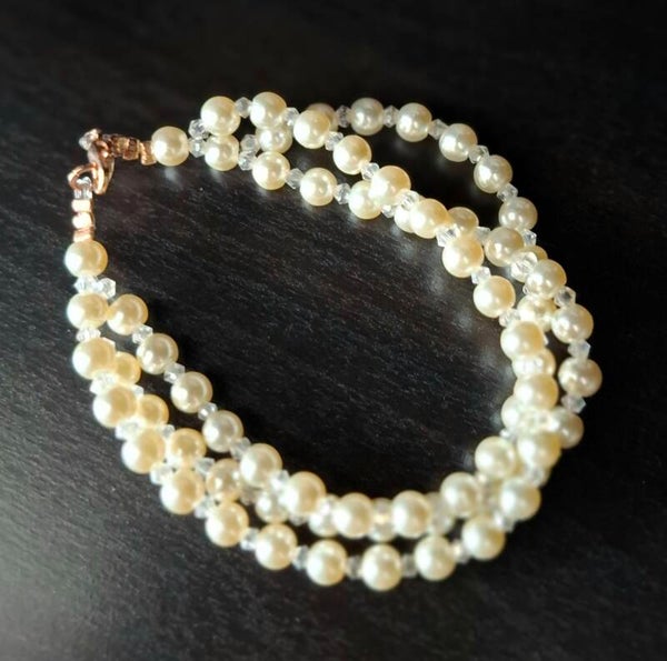 This handcrafted bracelet brings a touch of timeless elegance to your wrist. Warm champagne-colored glass pearls alternate with transparent beads, catching the light with every movement. Strung on durable nylon thread and finished with a rose gold-colored clasp, it sits comfortably on your wrist and is easy to wear.