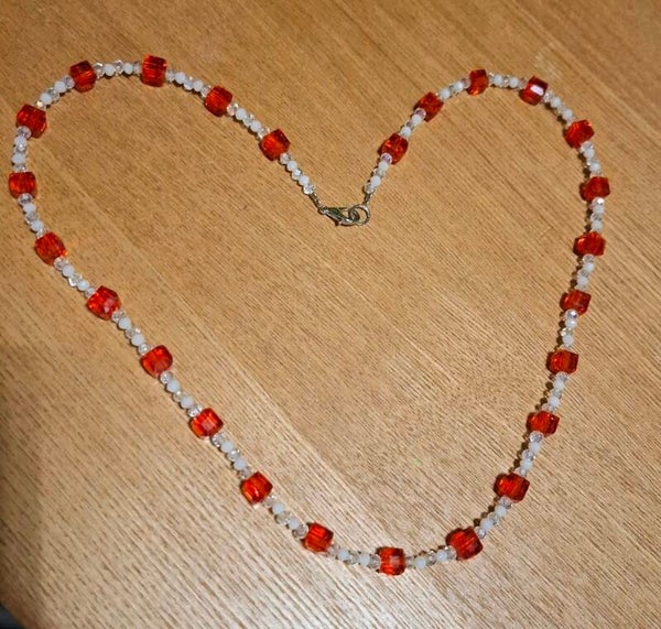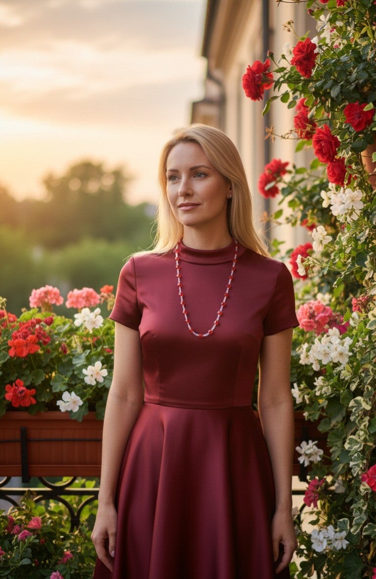This handmade necklace combines clean lines with intense shades of red, radiating timeless beauty that enhances any outfit. The mix of red glass beads and crystal-clear accents catches the light and creates subtle highlights – perfect for special occasions or as a stylish eye-catcher in everyday life.