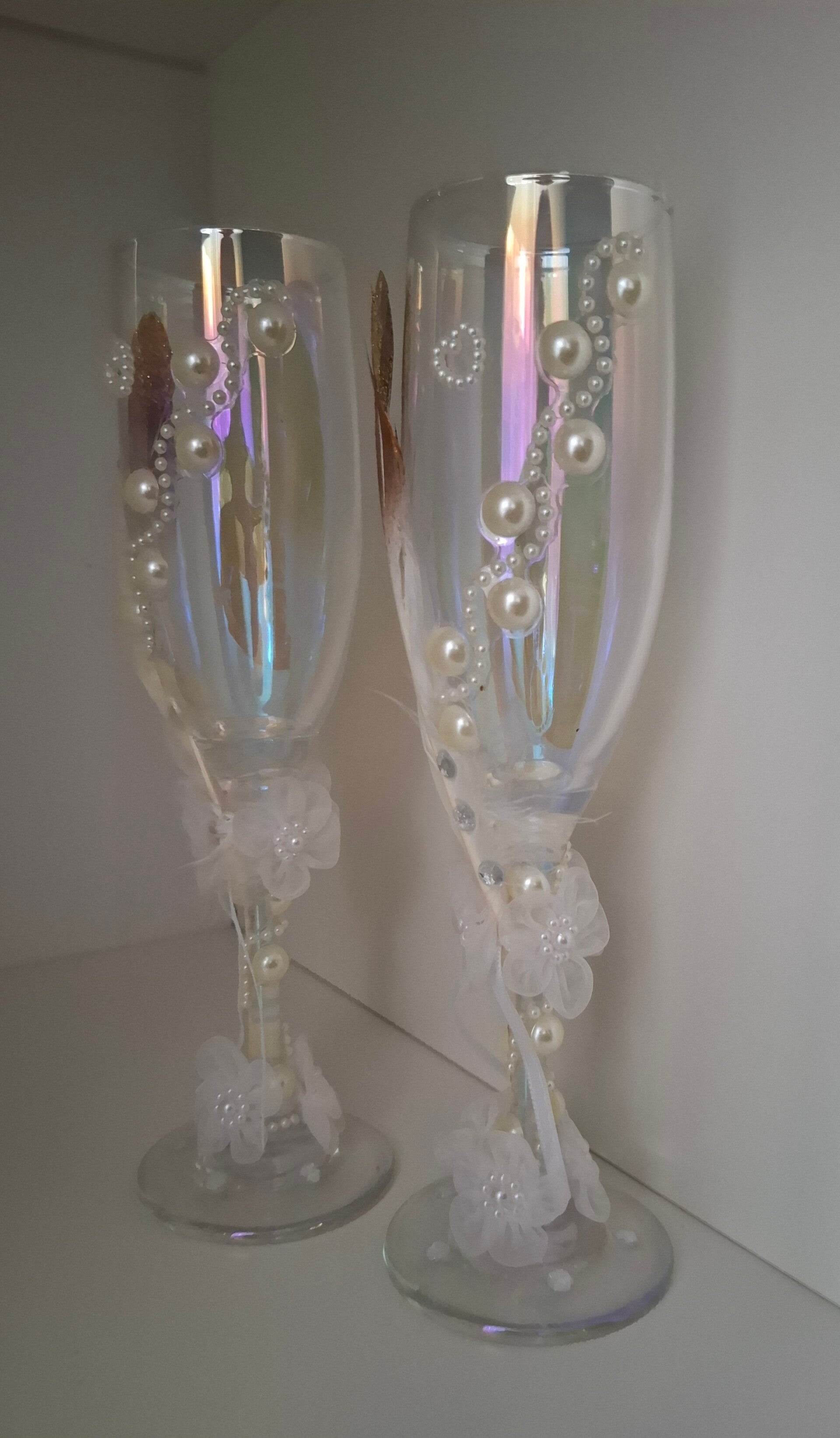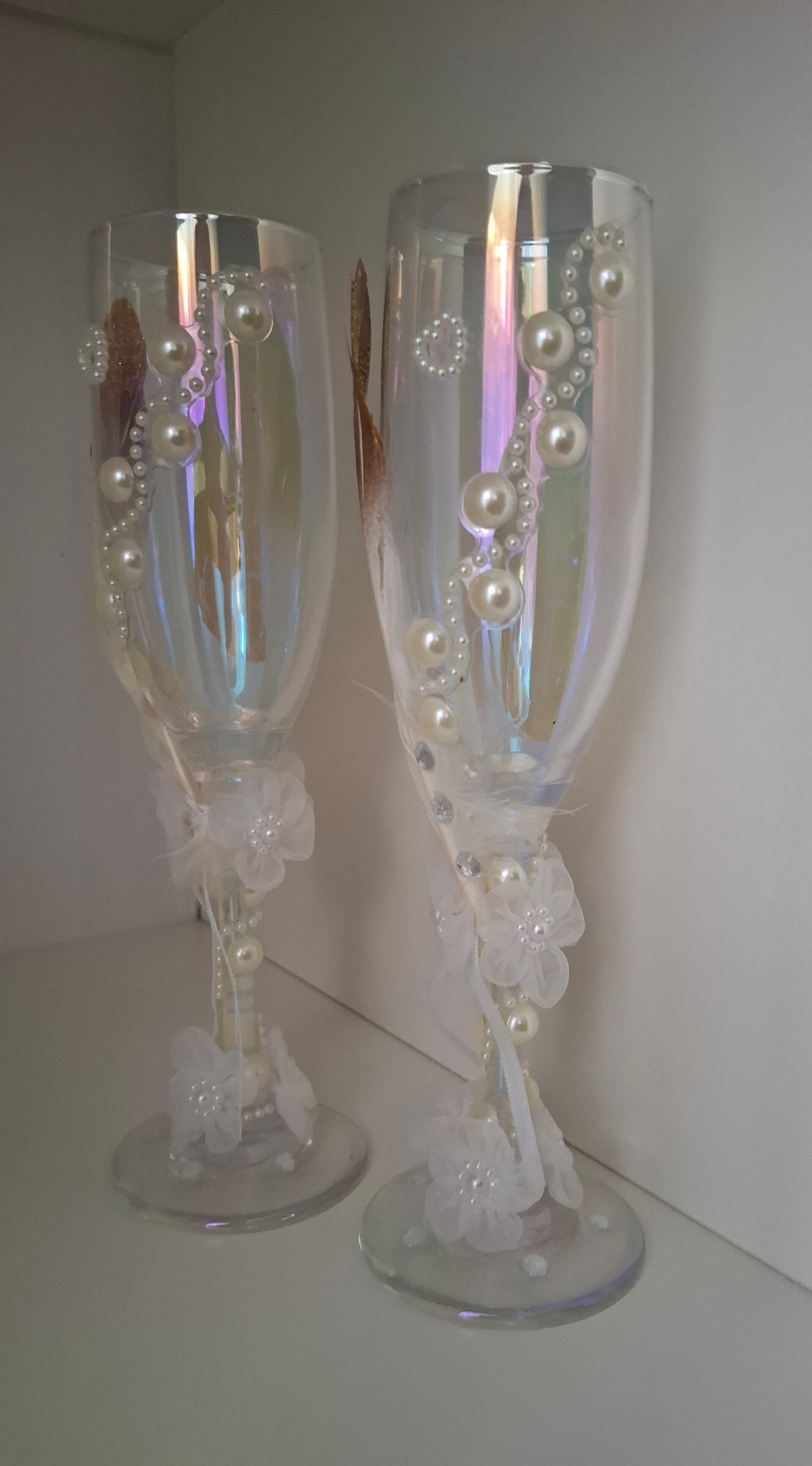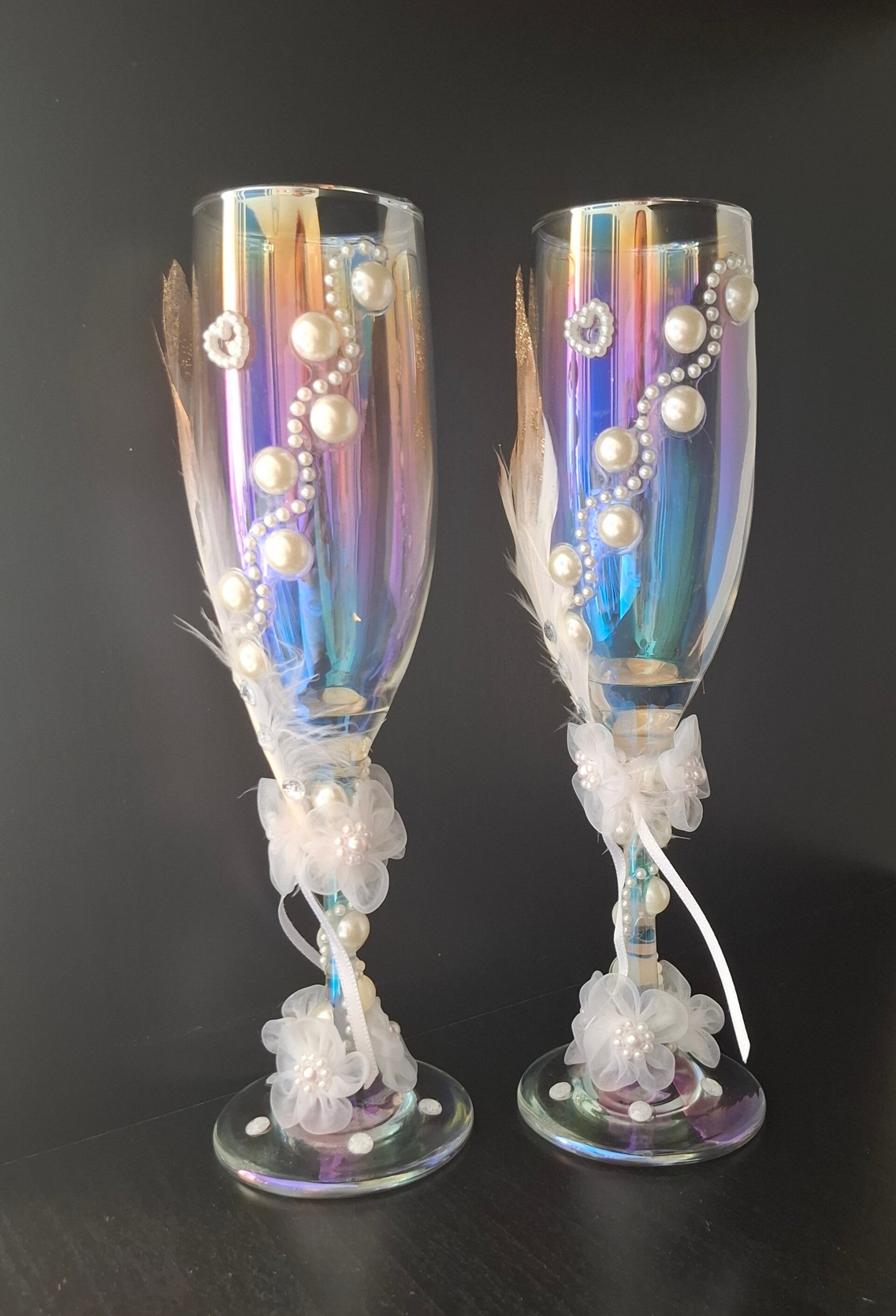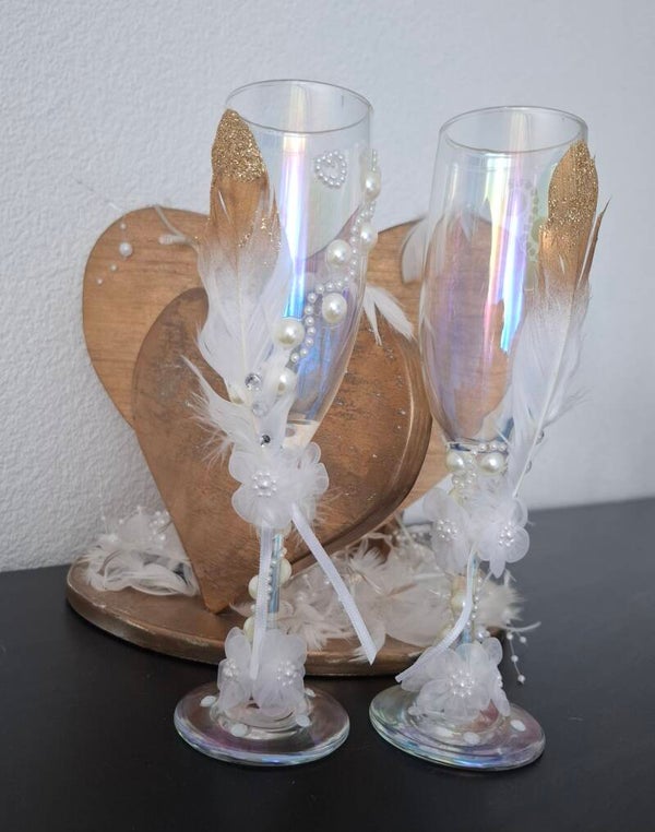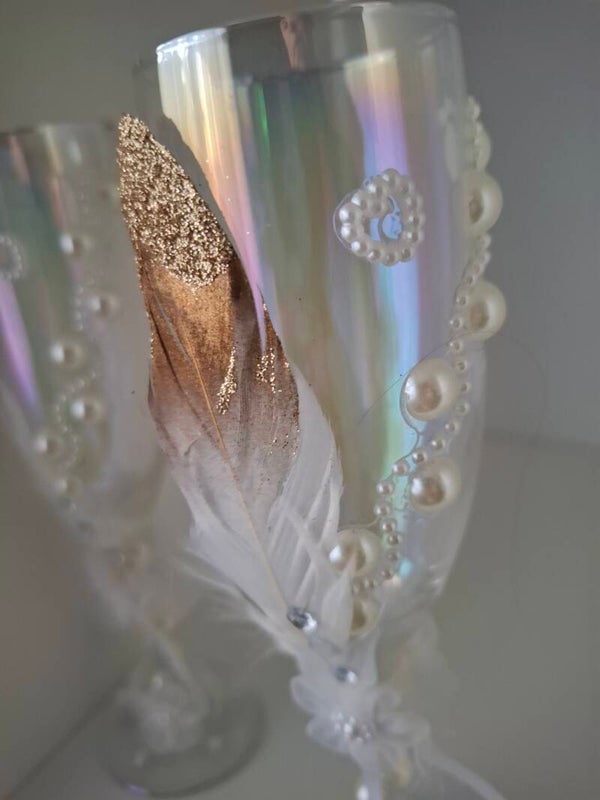Pearl Romance – Hand-decorated Wedding Glasses with Pearls, Feathers & Blossoms (2-piece Set)