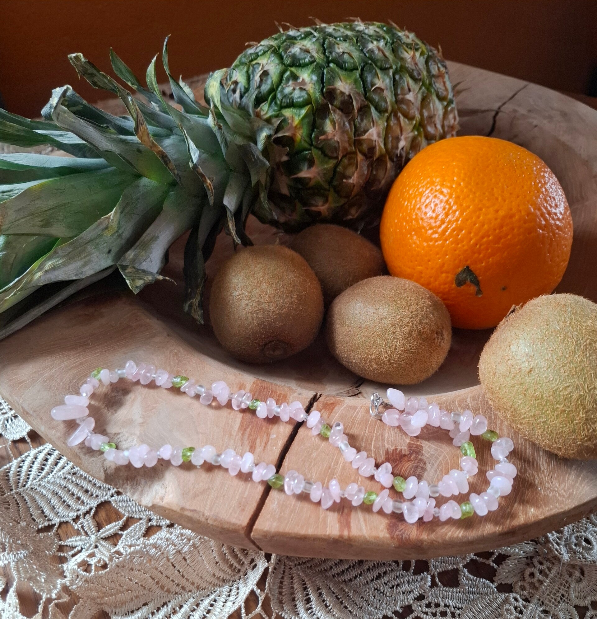 Gentle Rose Quartz opens you to love, harmony, and compassion, while the green accents of Peridot bring hope, vitality, and inner healing. Together, they create a soft energy field that empowers you and lets your inner light shine.