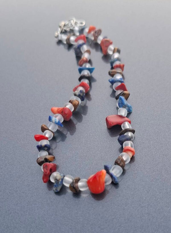 “Colors of the Sea” combines the vibrant energy of red coral, the protective strength of onyx and the grounding warmth of tiger’s eye. Each bead reflects a drop of nature – a mosaic of sea, earth and fire.