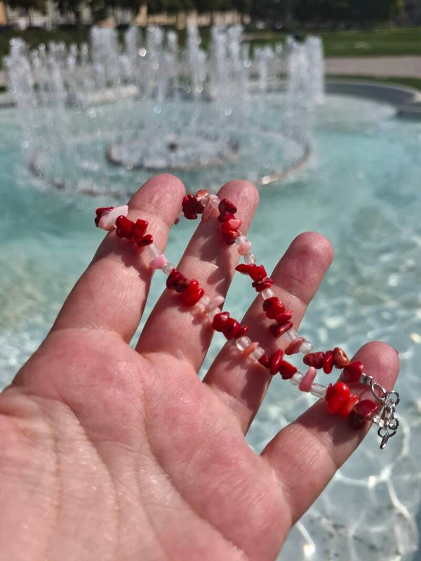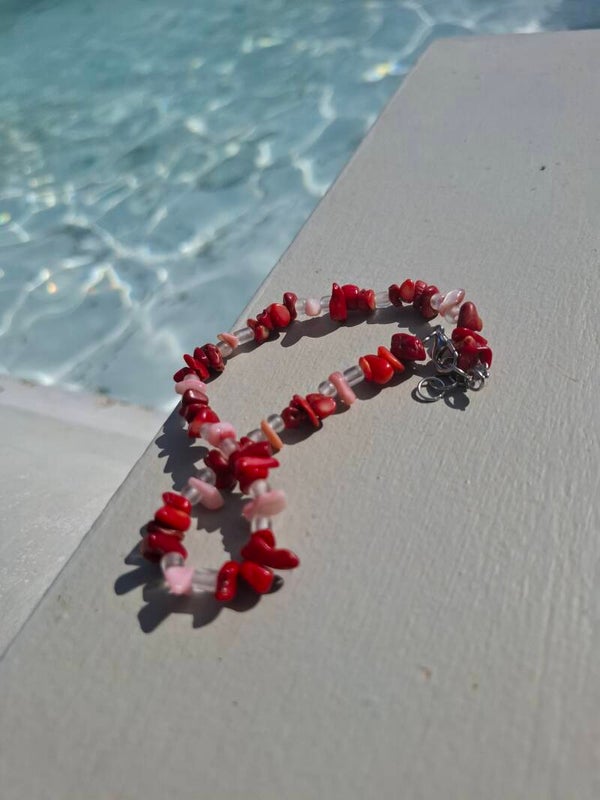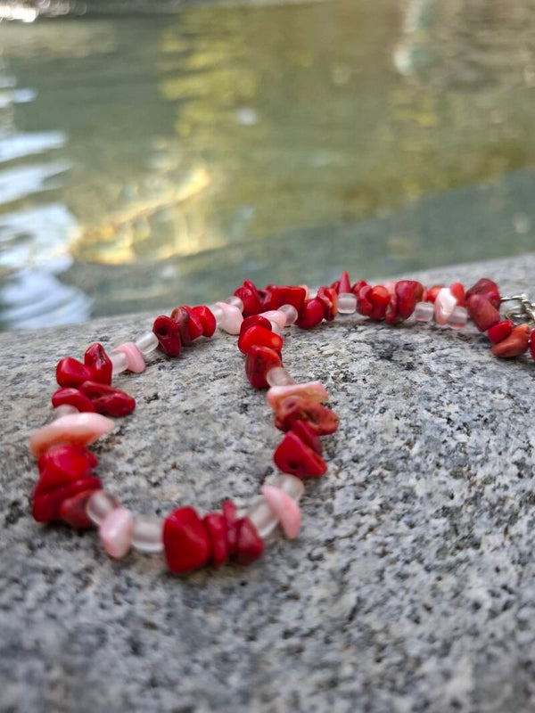“Burning Desire” blends the fiery power of red coral with the soft tenderness of pink coral. Handmade, lightweight and expressive – an anklet that lets passion and gentleness flow with every step.