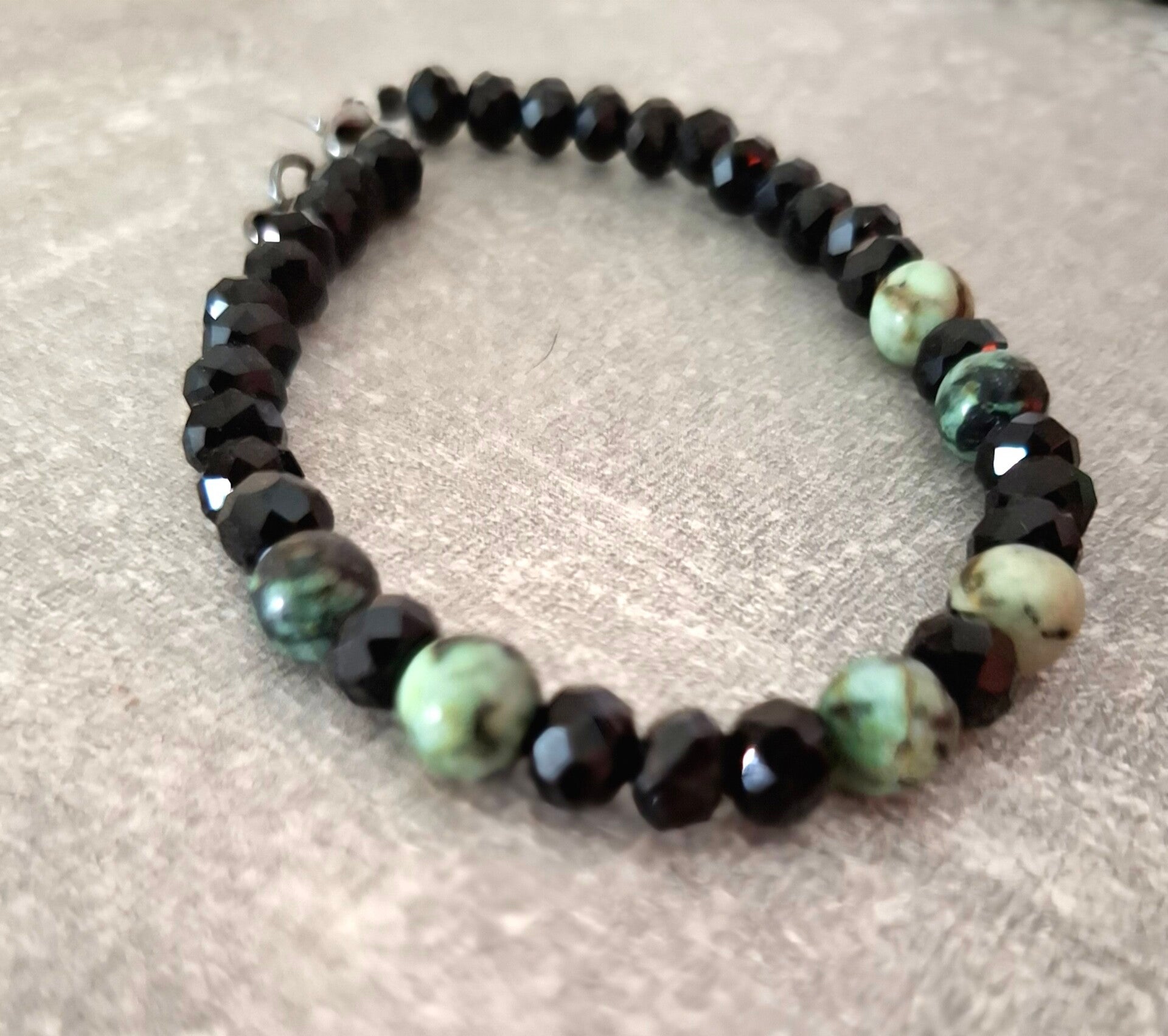 Materials: African Turquoise, faceted glass beads, metal clasp