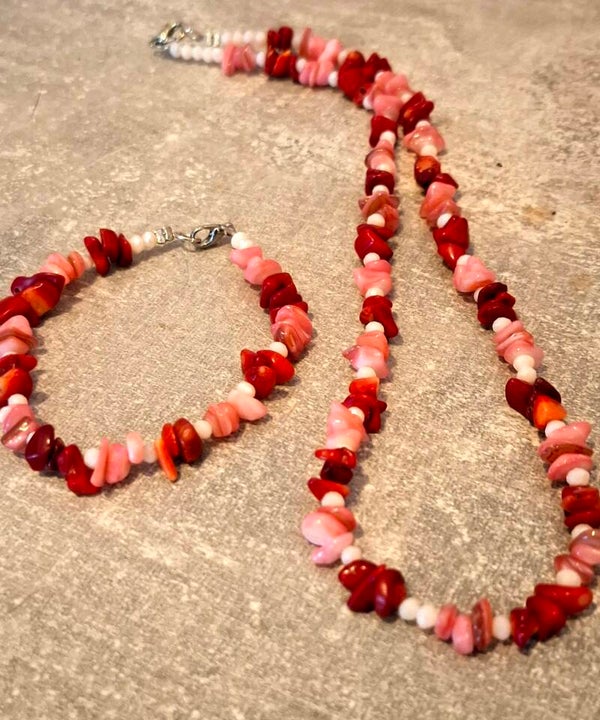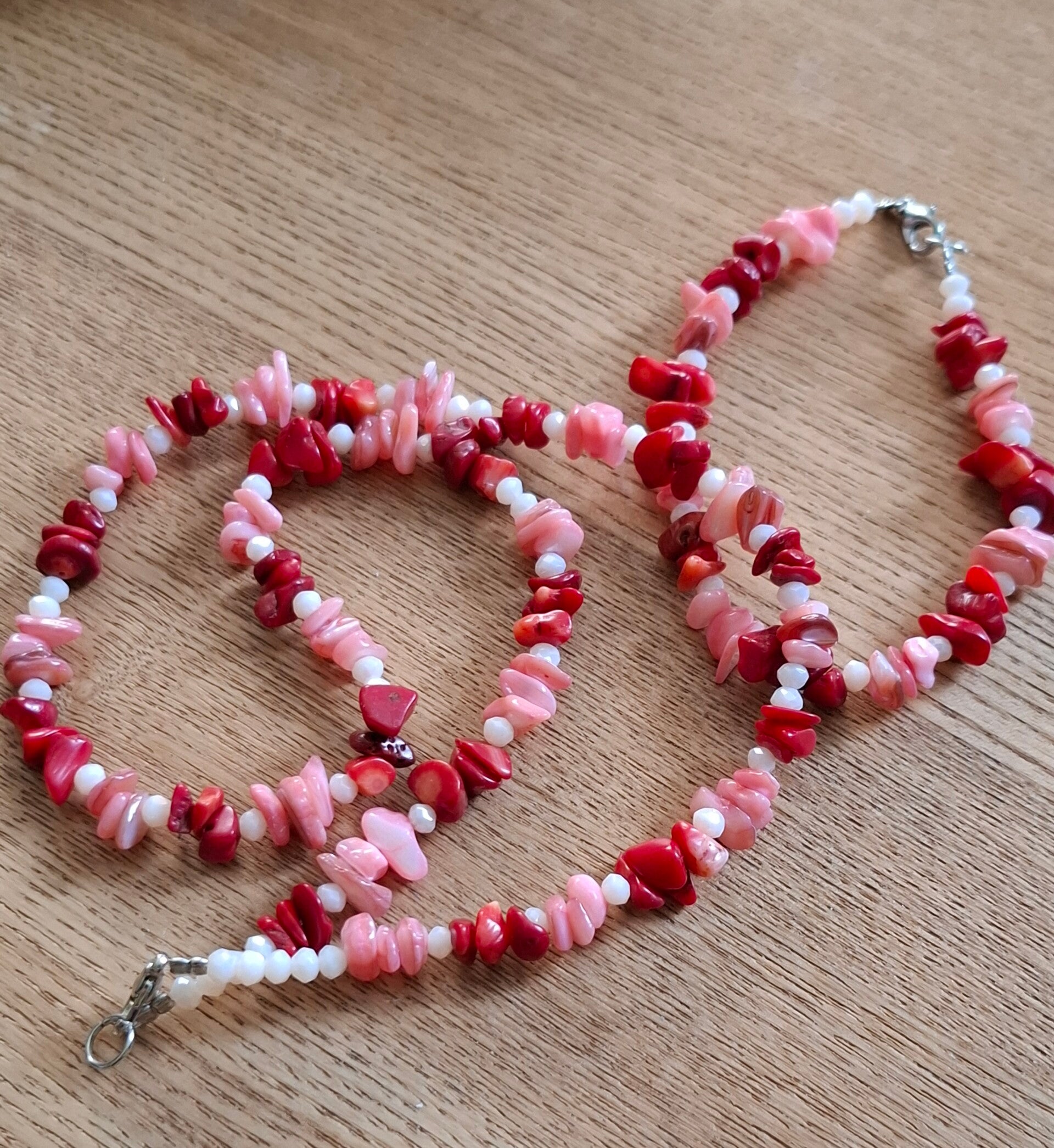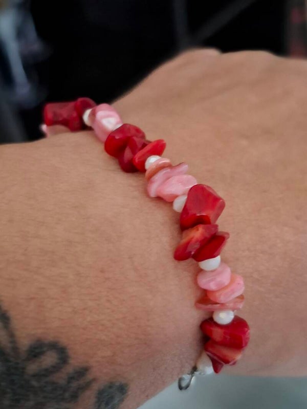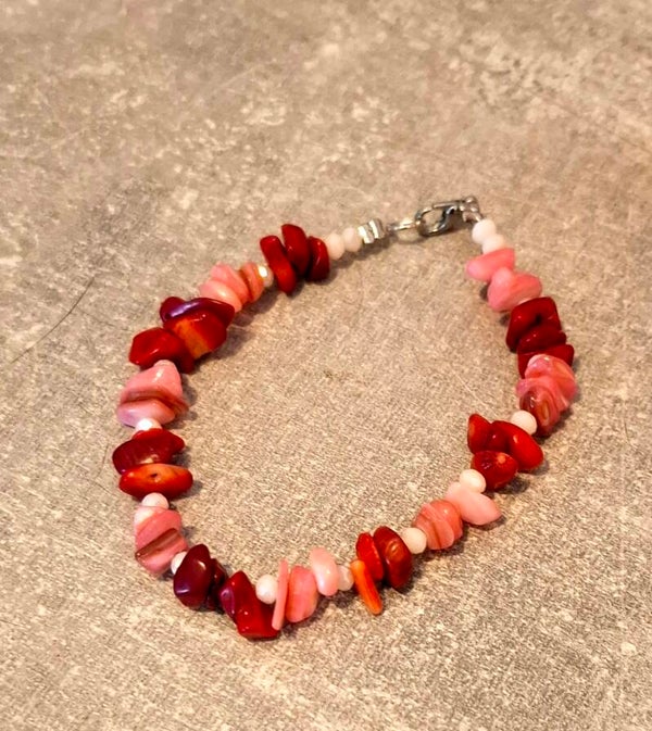 Materials: red coral chips, pink shell stones, small white glass beads, silver-colored metal clasp