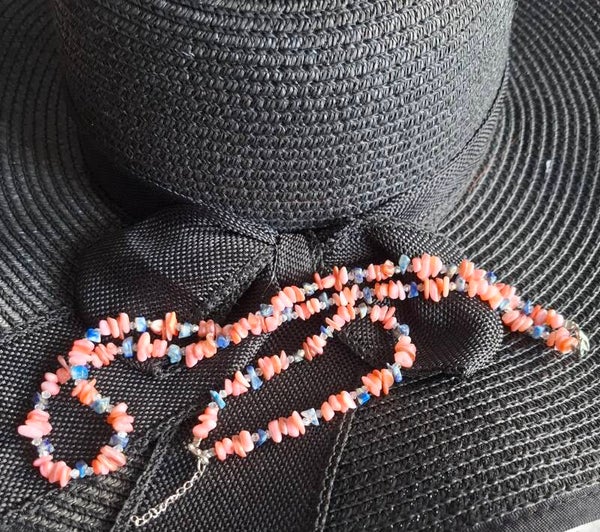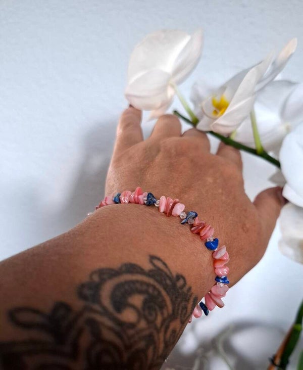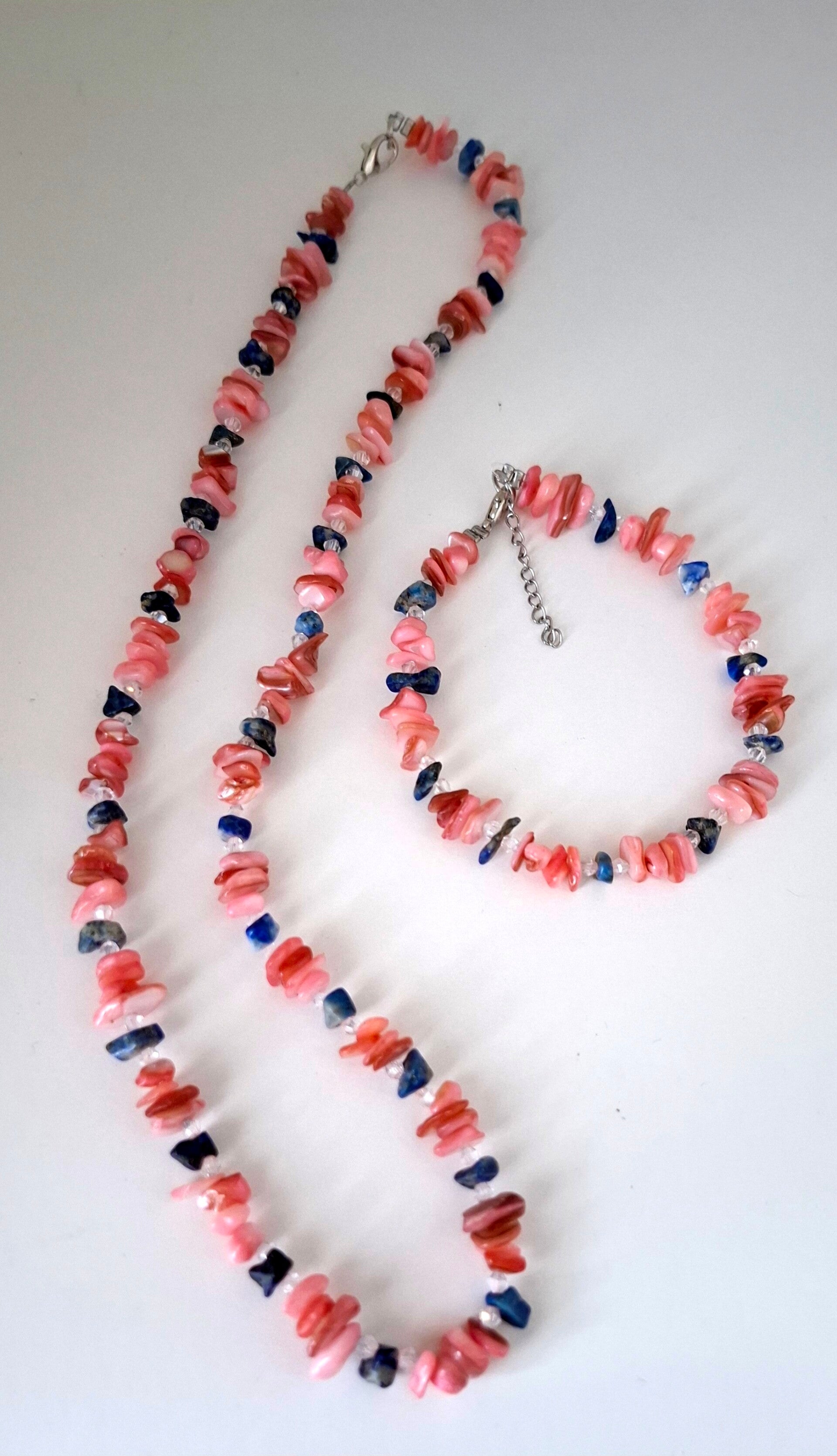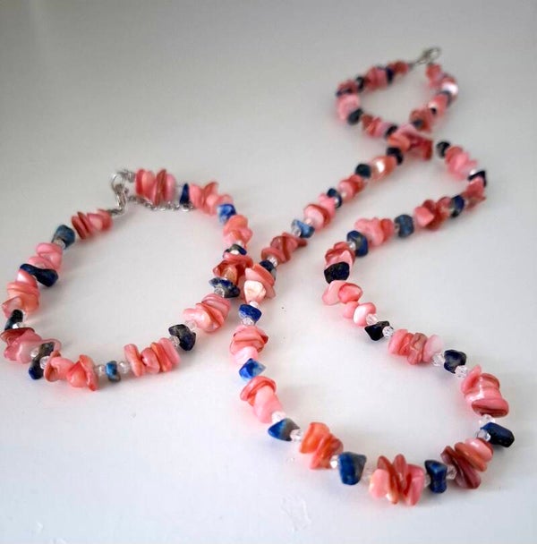 This handmade bracelet combines the soft energy of pink coral with the deep strength of lapis lazuli. In between, crystal glass beads shine like sunlight dancing on the waves.