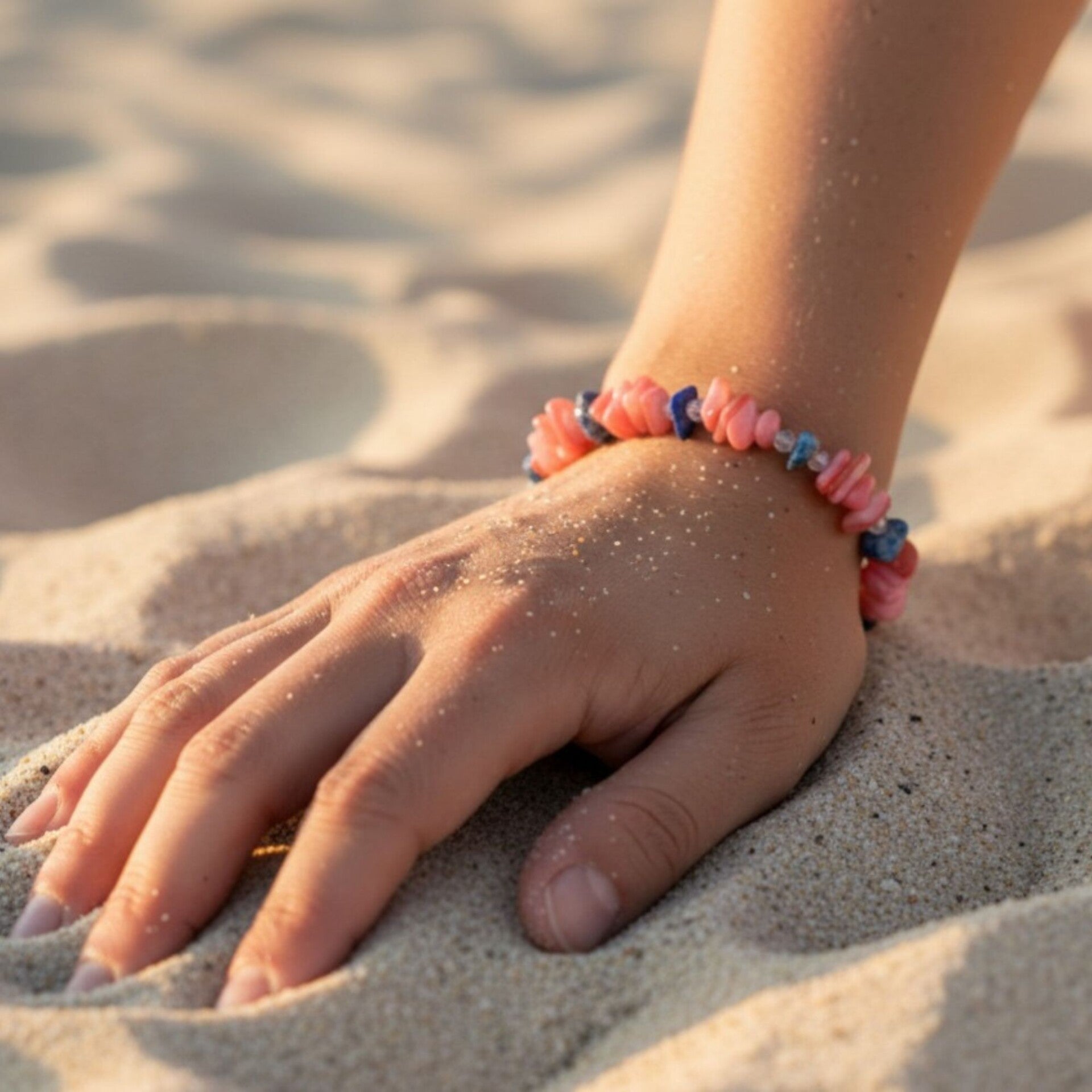 Inspired by the nurturing rhythm of ocean waves, this bracelet unites warmth and depth in perfect harmony. The delicate glow of pink coral meets the rich blue intensity of lapis lazuli, creating a balance between heart and mind, softness and strength.