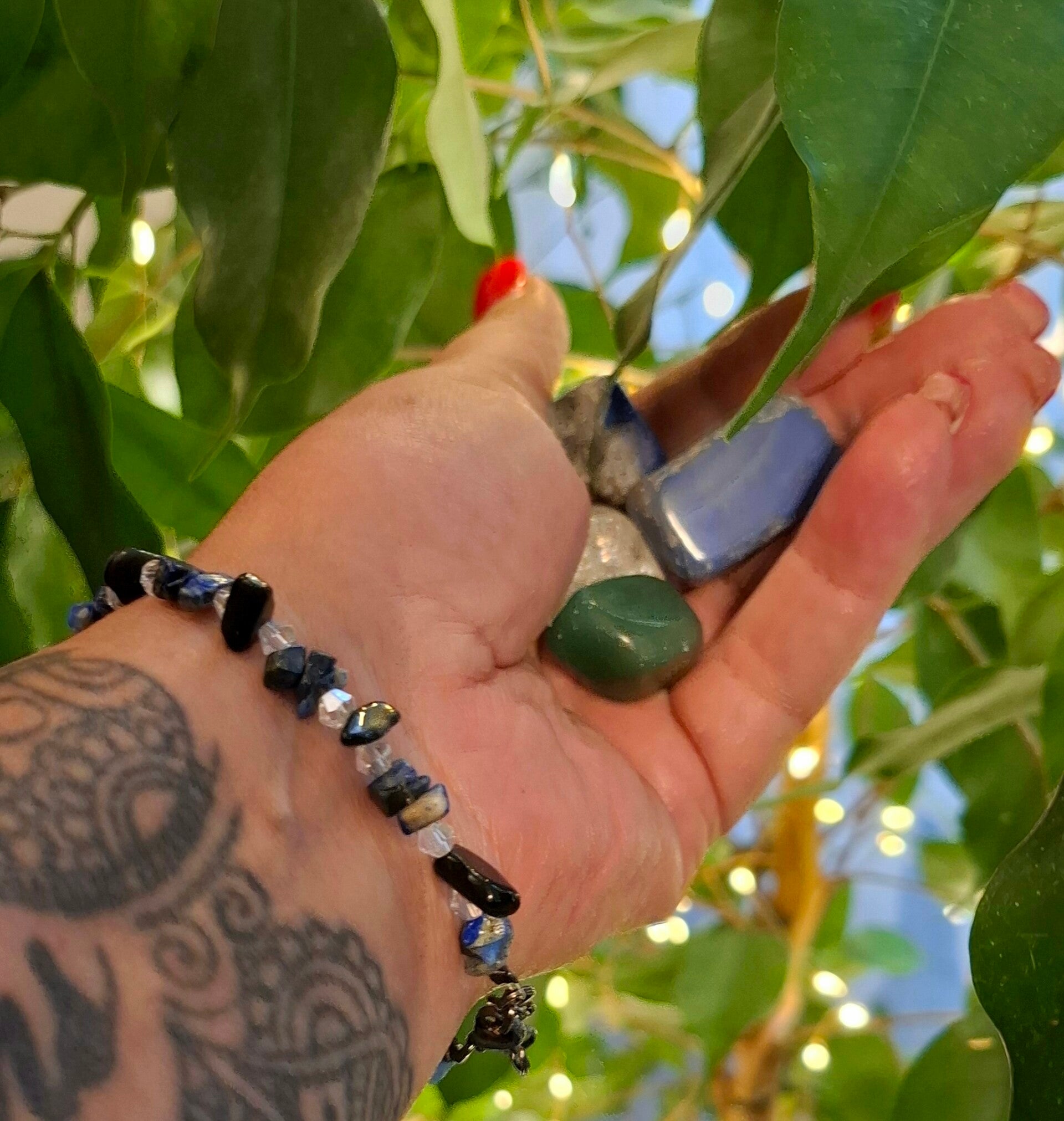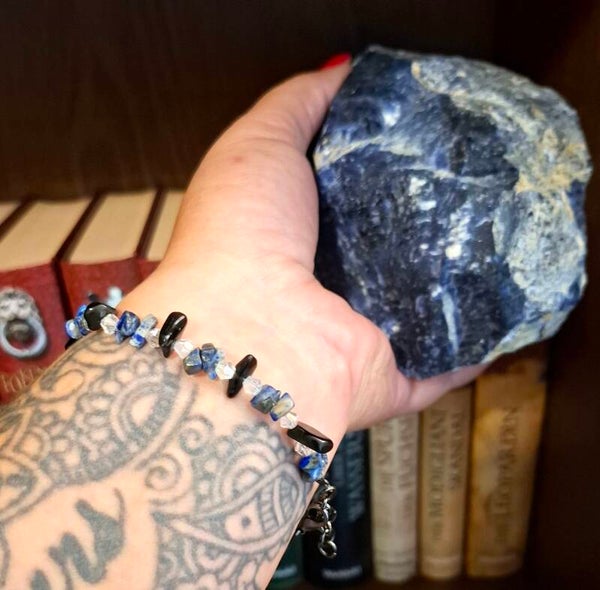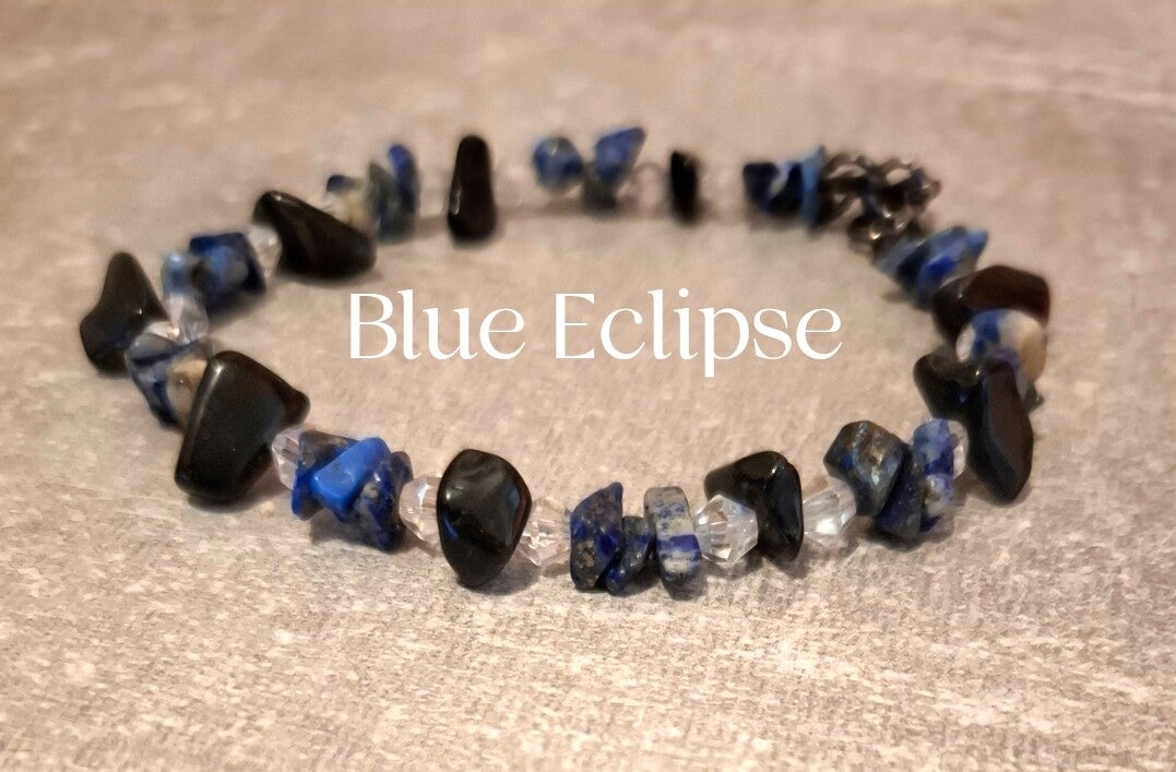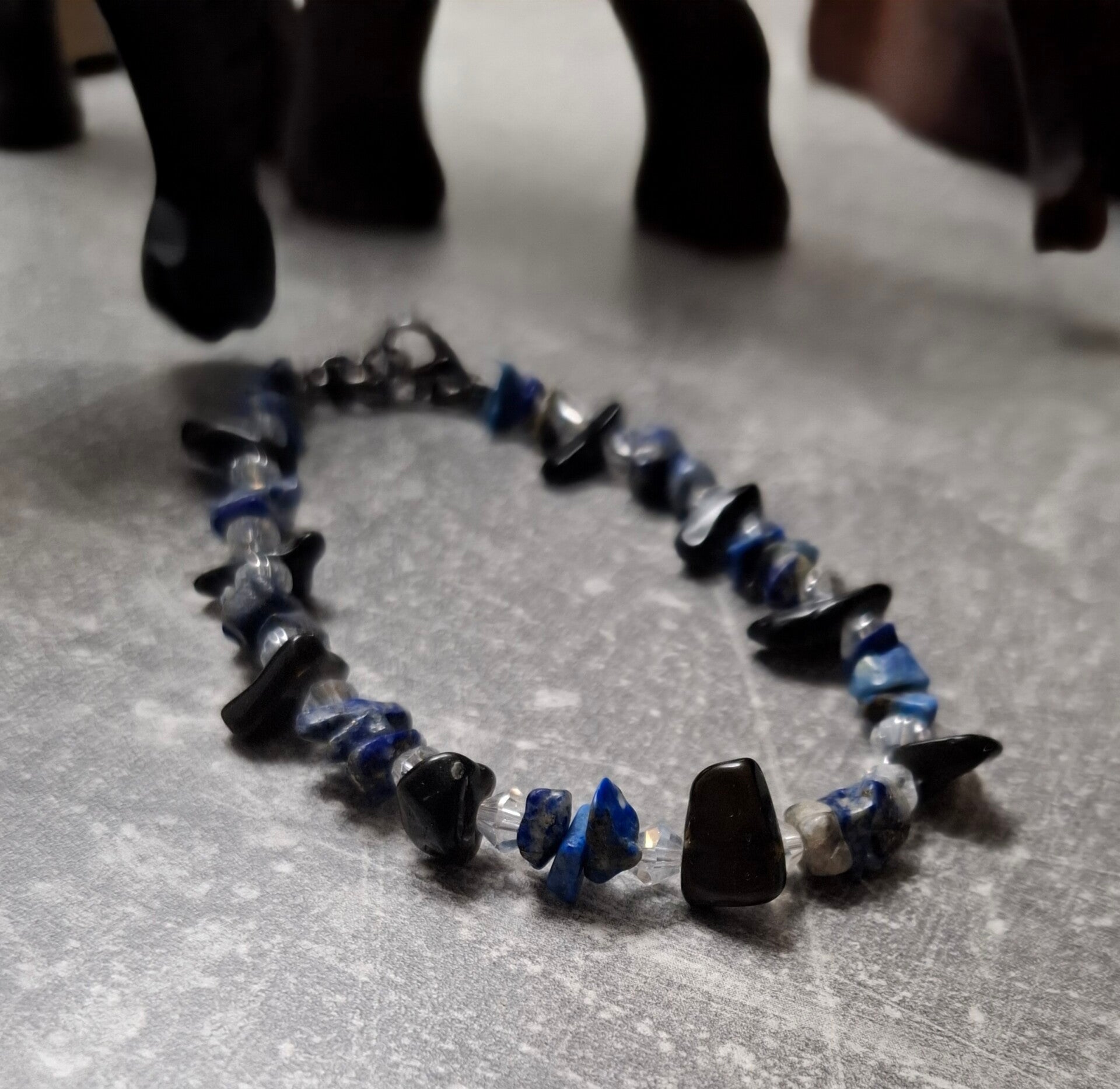 This handmade bracelet combines the wisdom of Lapis Lazuli, the protective power of Onyx, and the sparkling clarity of crystal beads. Inspired by a mysterious lunar eclipse, it symbolizes strength, truth, and inner clarity.