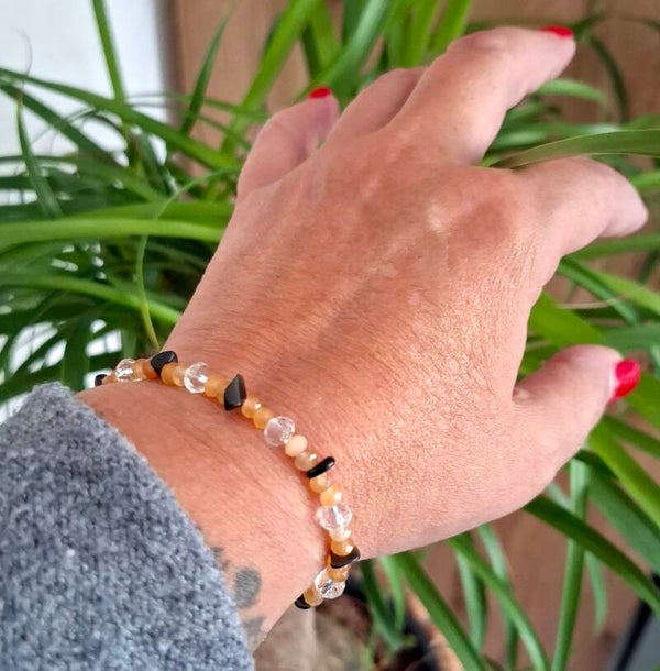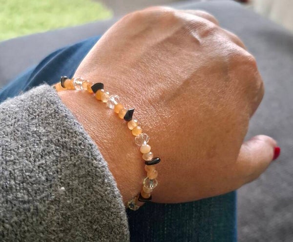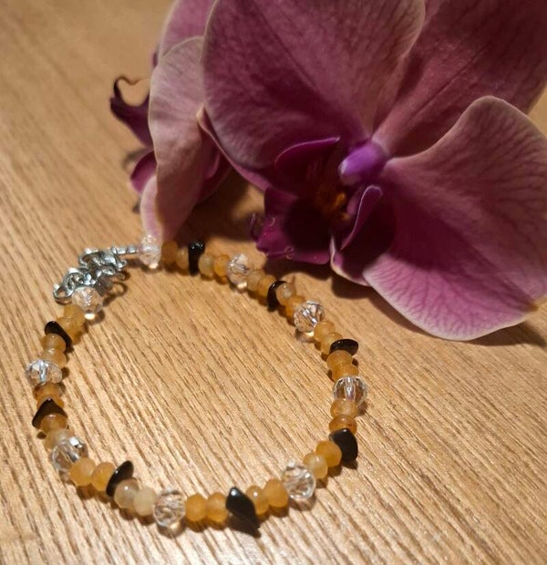 Citrine, known as the stone of joy and abundance, brings light and warmth into your life. Black Onyx protects your energy, while sparkling glass beads make this bracelet glow with elegance.