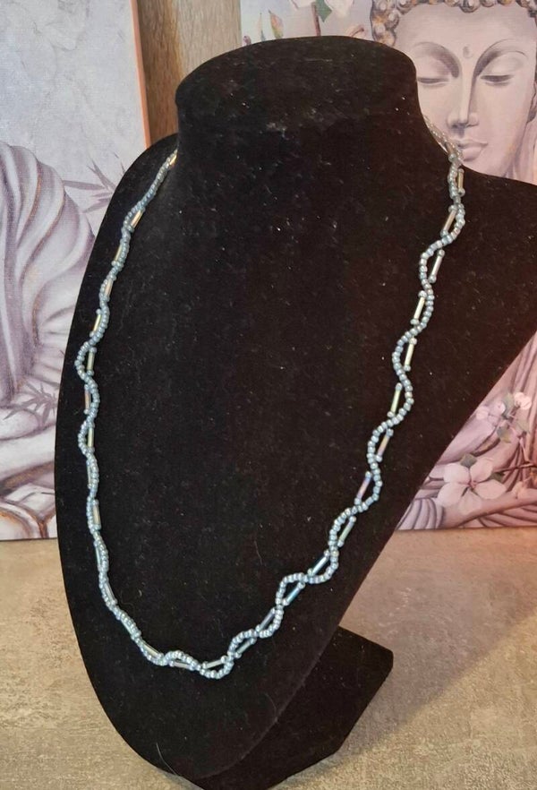 Like a whisper from the universe – the Nebula Pearl necklace captures the light of distant stars within shimmering glass beads.