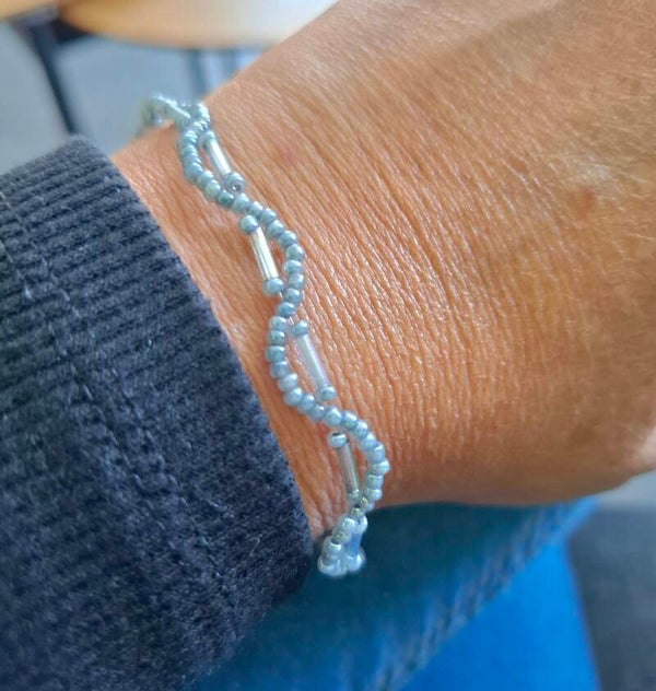 The Nebula Pearl bracelet carries the quiet magic of the universe – a delicate dance of soft grey glass beads that shimmer like distant stars.